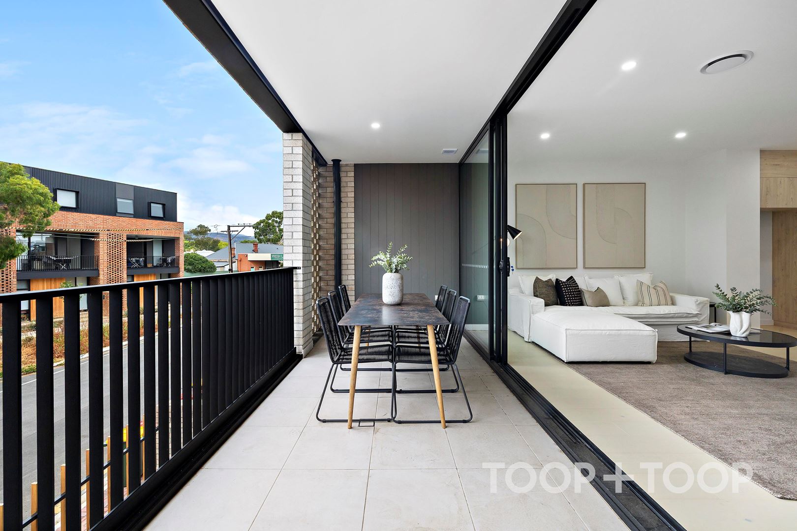 At its heart, open-plan living and dining seamlessly connects to a spacious balcony via floor-to-ceiling sliding glass doors, creating a natural extension of the main living space, perfect for outdoor dining or relaxed entertaining.