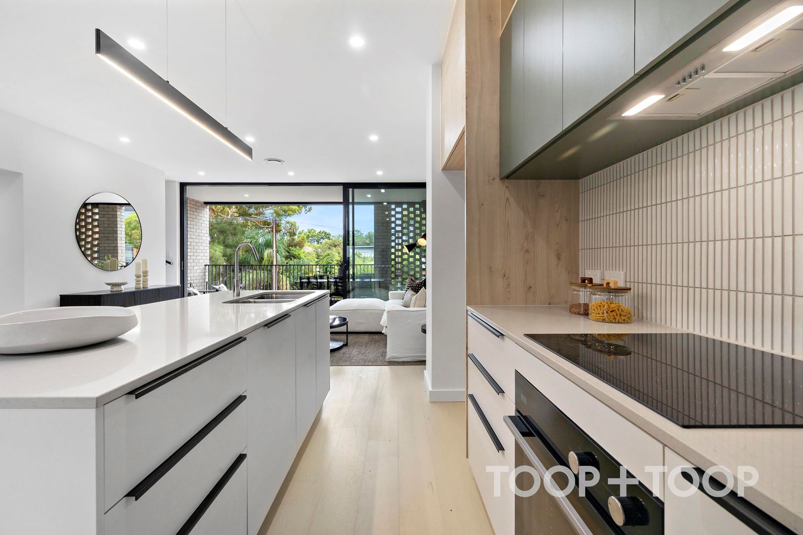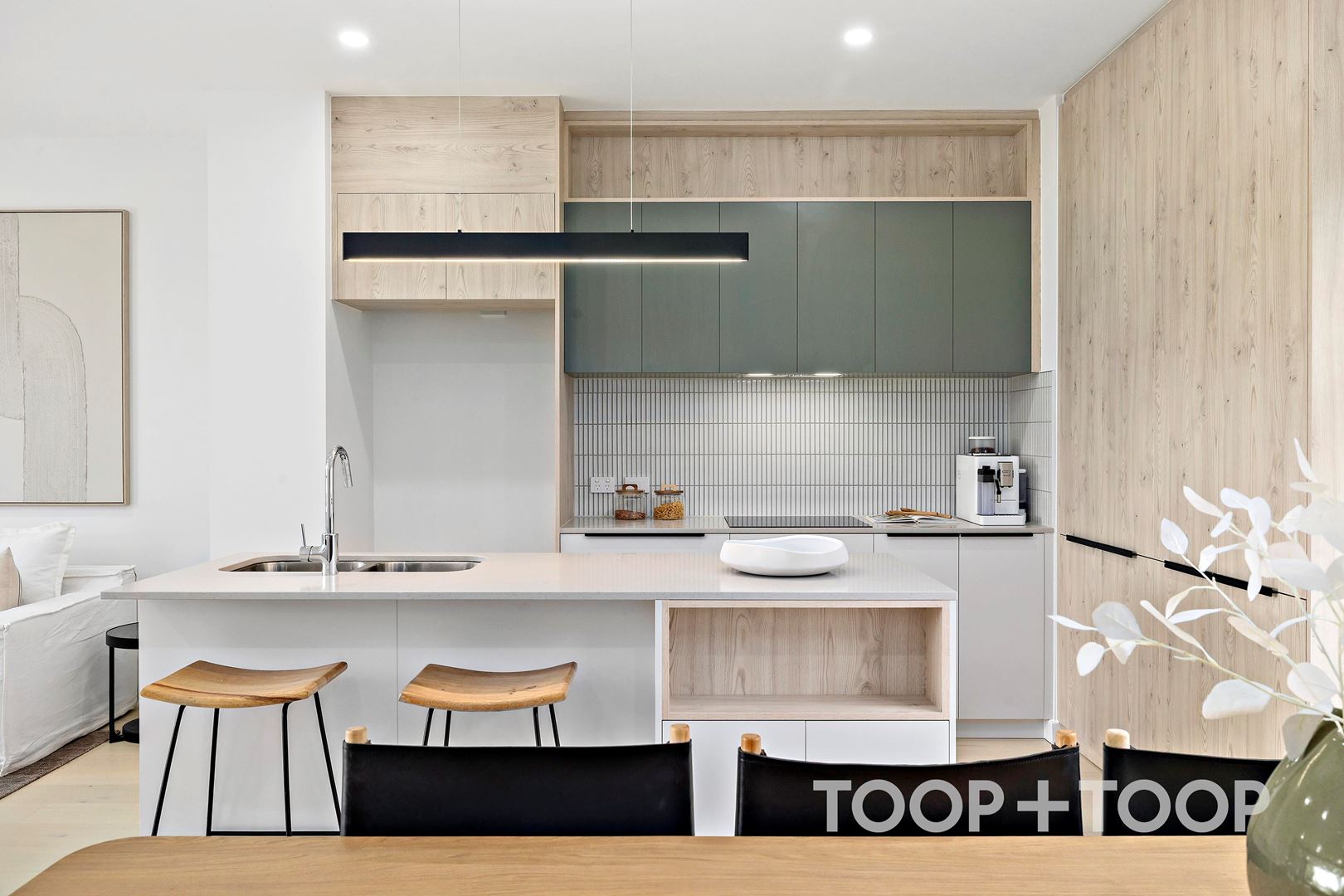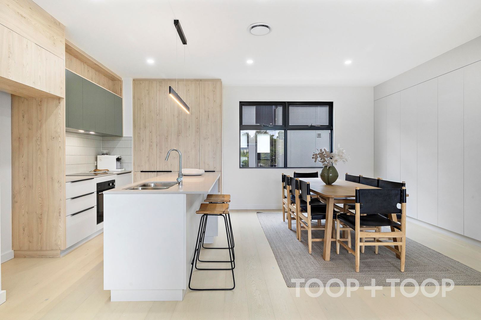 The designer kitchen pairs functionality with striking detail, featuring soft green overhead cabinetry, premium appliances and a generous double pantry. At its centre, a striking breakfast bar sits beneath a sleek pendant light, creating an ideal setting for easy meal preparation and casual eating. Built-in storage within the light-filled dining area further enhances the home’s practicality without compromising on style.