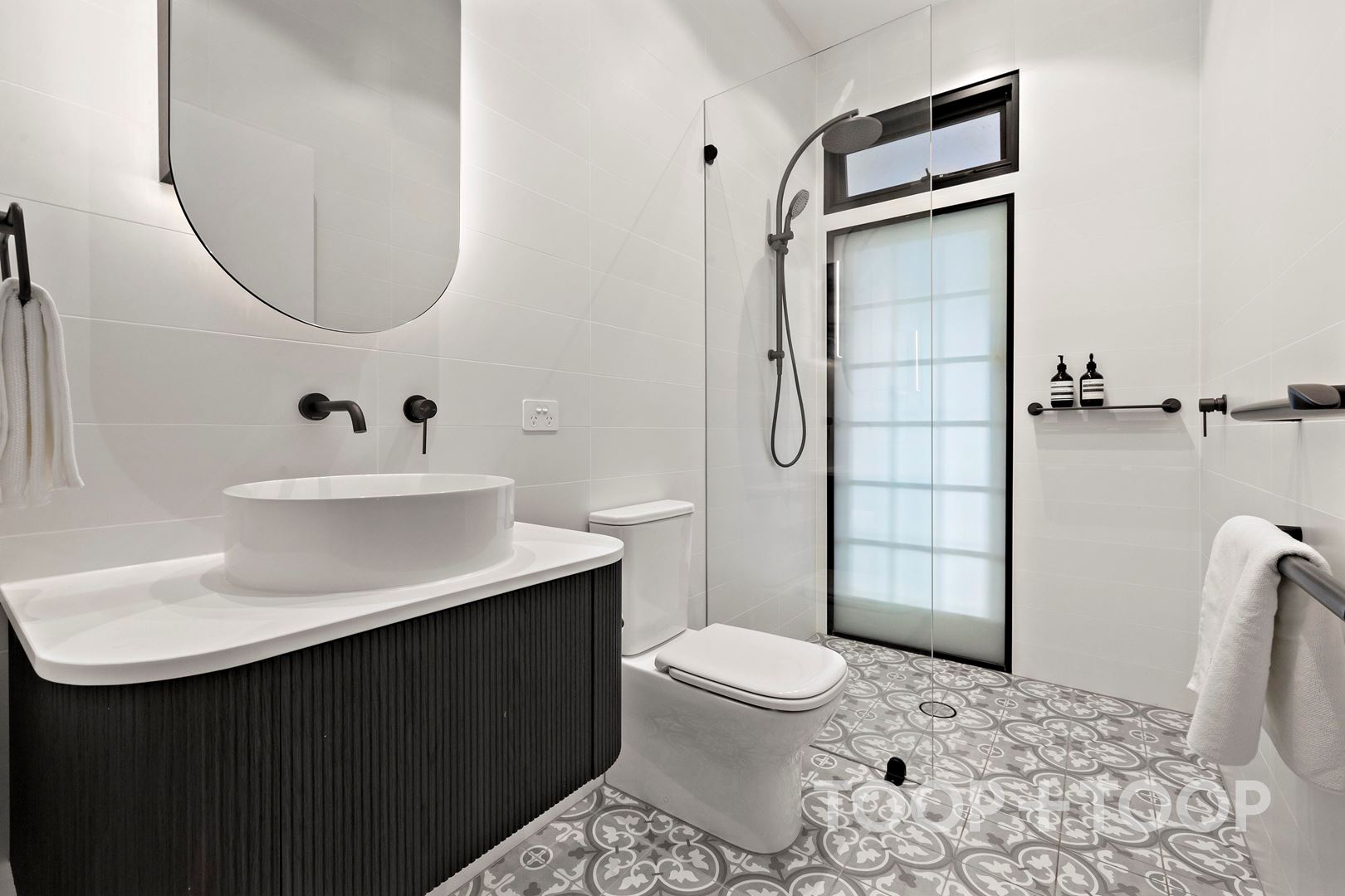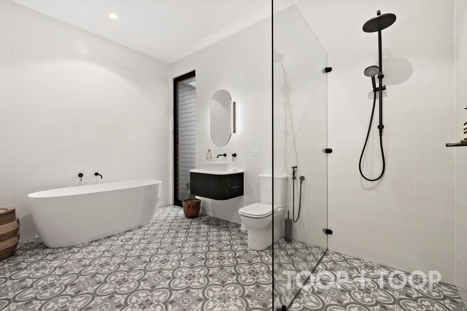 A gallery-style hallway, perfect for displaying artwork, leads to the accommodation wing. The master suite is a private haven with wall-to-wall robes and a luxurious spa-like ensuite, featuring a walk-in shower, dual shower heads, vanity storage and intricate, tessellated floor tiles. Two additional bedrooms provide versatility for guests or a home office, complemented by an impressively spacious main bathroom, a sanctuary in itself, with a freestanding bath and cohesive finishes.