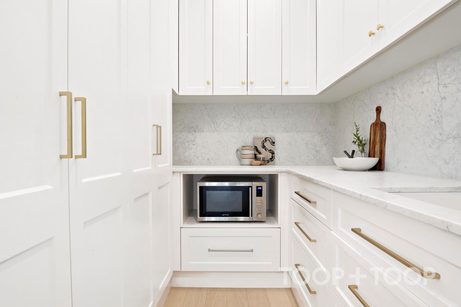 • Designer kitchen with stone benchtops, shaker cabinetry and butler’s pantry