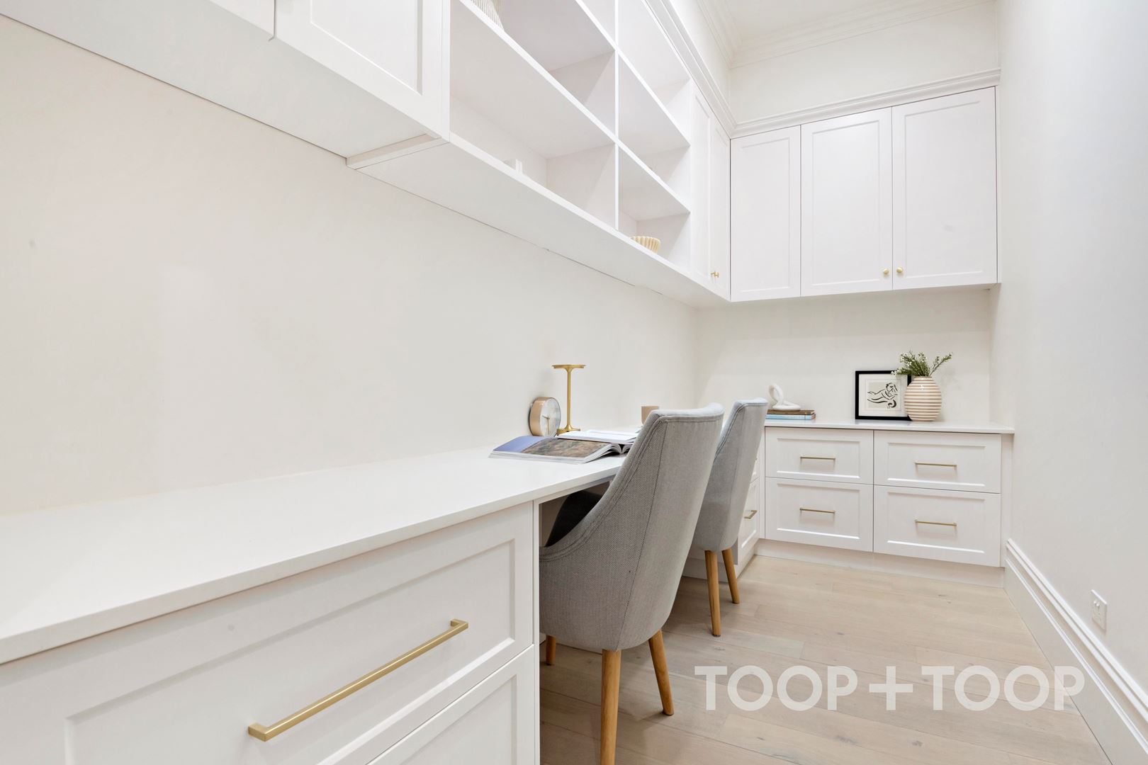 Enjoy a designated home office which is a standout feature, offering a built-in, stone top workstation, along with an abundance of overhead storage and room for multiple desks, perfect for remote work, study or small-business needs.