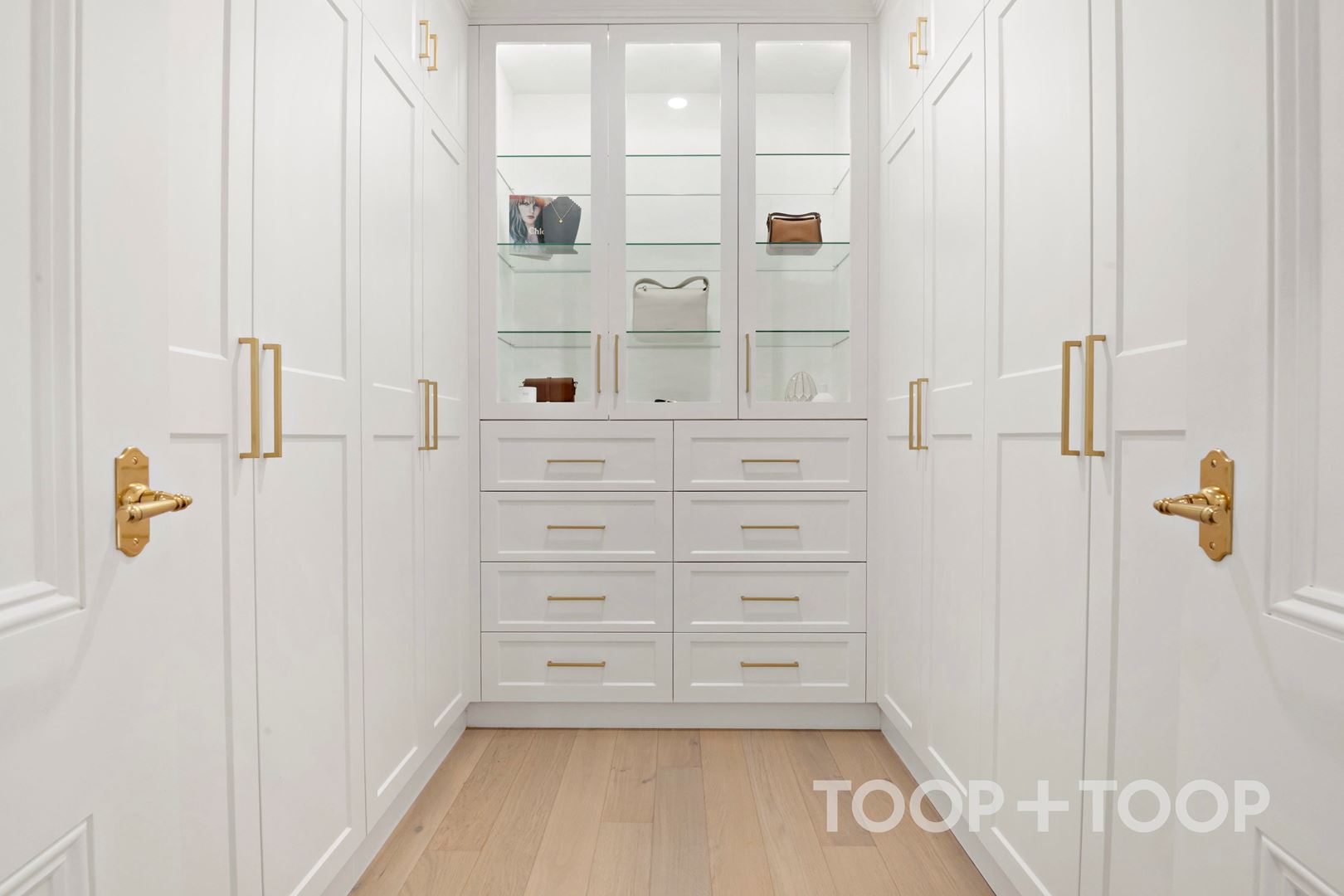 The main bedroom is a tranquil retreat, featuring modern yet tasteful plantation shutters, soft natural light and a showpiece walk-in dressing room with custom joinery and glass-fronted cabinetry. The adjoining ensuite is pure luxury, complete with brass fittings, a quality stone vanity and a skylight that bathes the room in natural light.