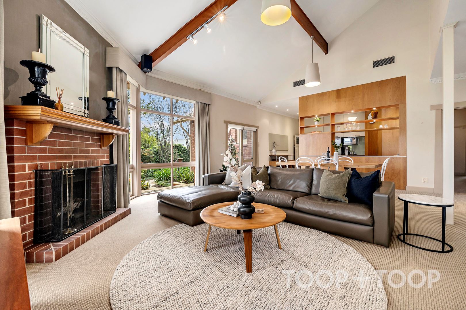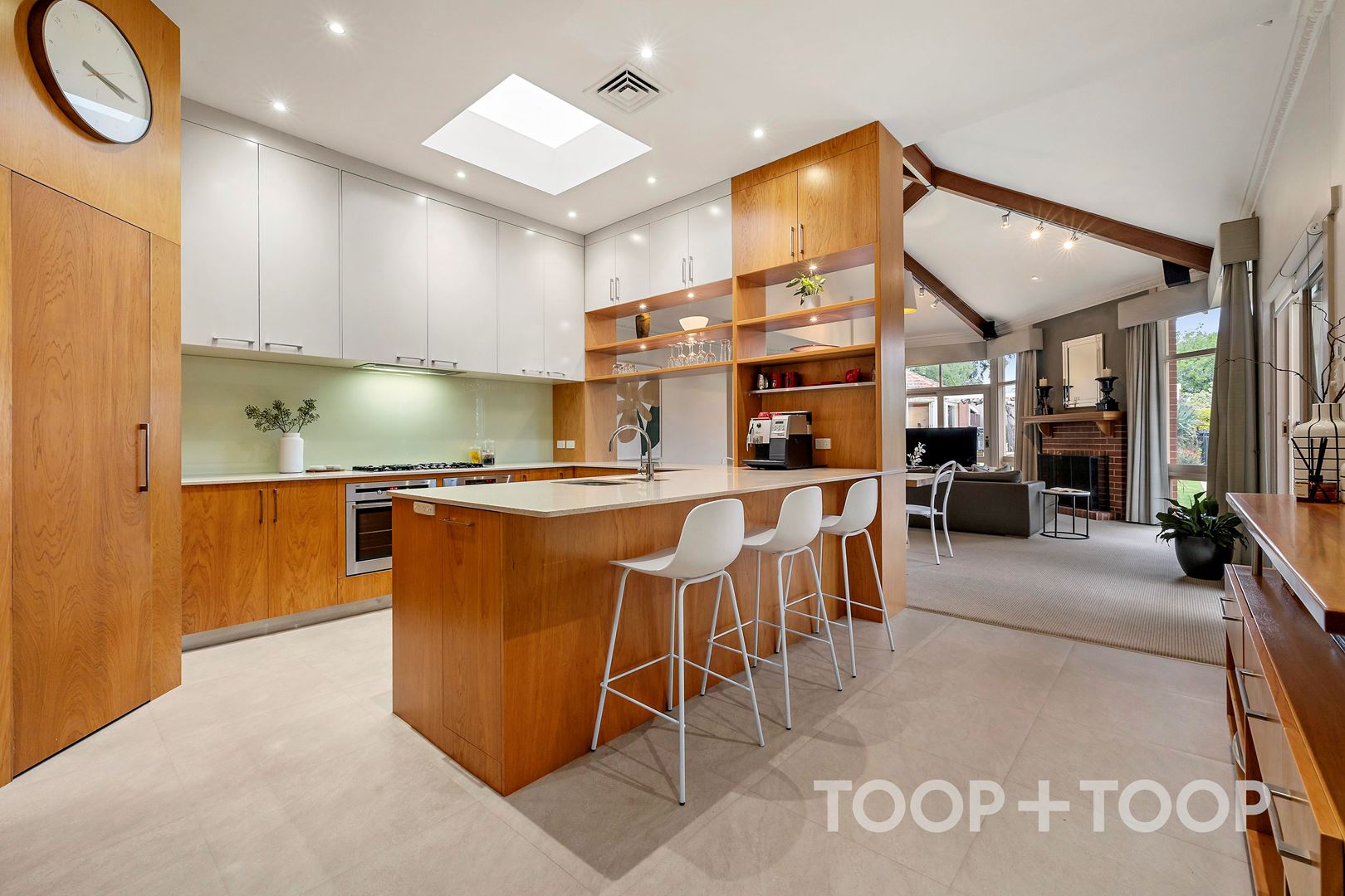 At the heart of the home, the open-plan kitchen, dining and living domain celebrates light, volume and connection. Exposed timber beams, a feature fireplace and a skylight create a space both welcoming and striking. The gourmet kitchen, appointed with dual AEG ovens, gas cooktop, Miele dishwasher and a large walk-in pantry, is designed for both everyday ease and entertaining. Sliding glass doors allow for seamless integration with the outdoor terrace, pool and landscaped gardens.