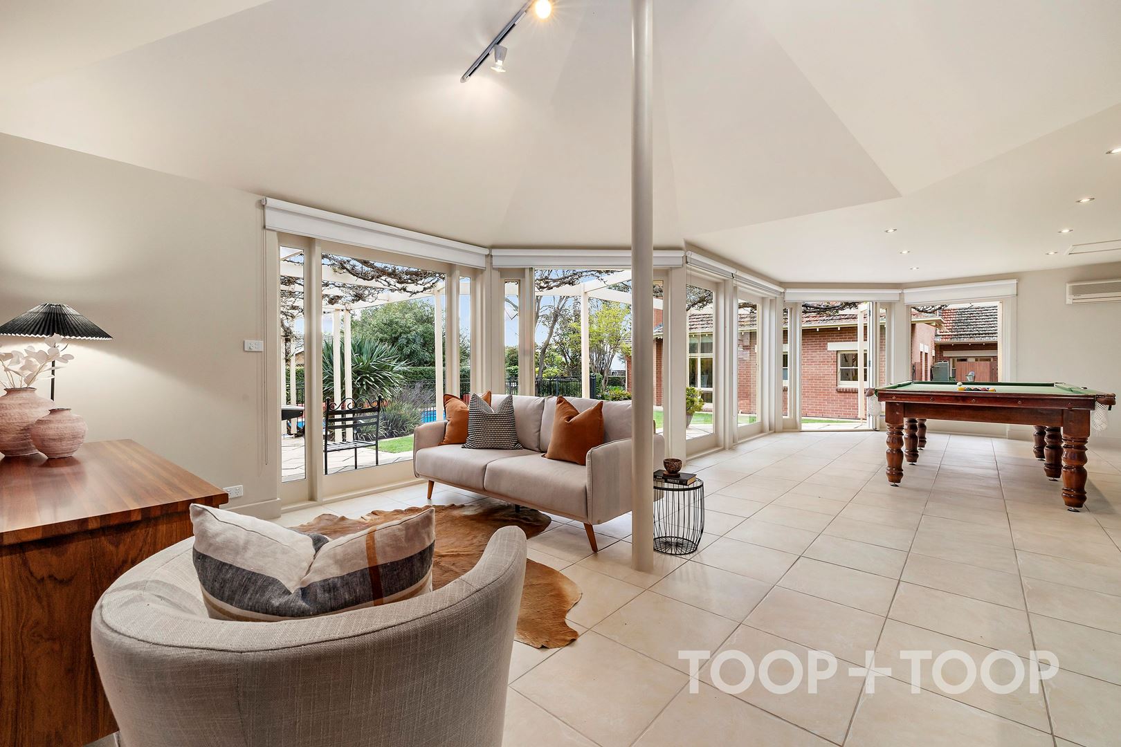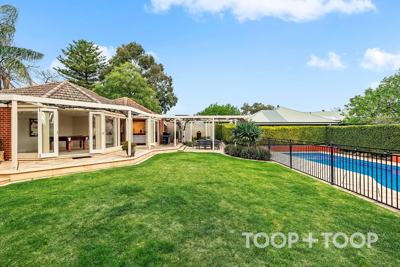 Manicured lawns and established gardens frame a lifestyle of outdoor enjoyment. The 12.5m solar-heated saltwater pool takes centre stage, complemented by a pool/guest house with a kitchenette and French doors opening to a private courtyard, a great space for casual entertaining. The expansive rear lawn offers impressive scope for a tennis court (STCC), while also providing a setting designed for both relaxation and entertaining.