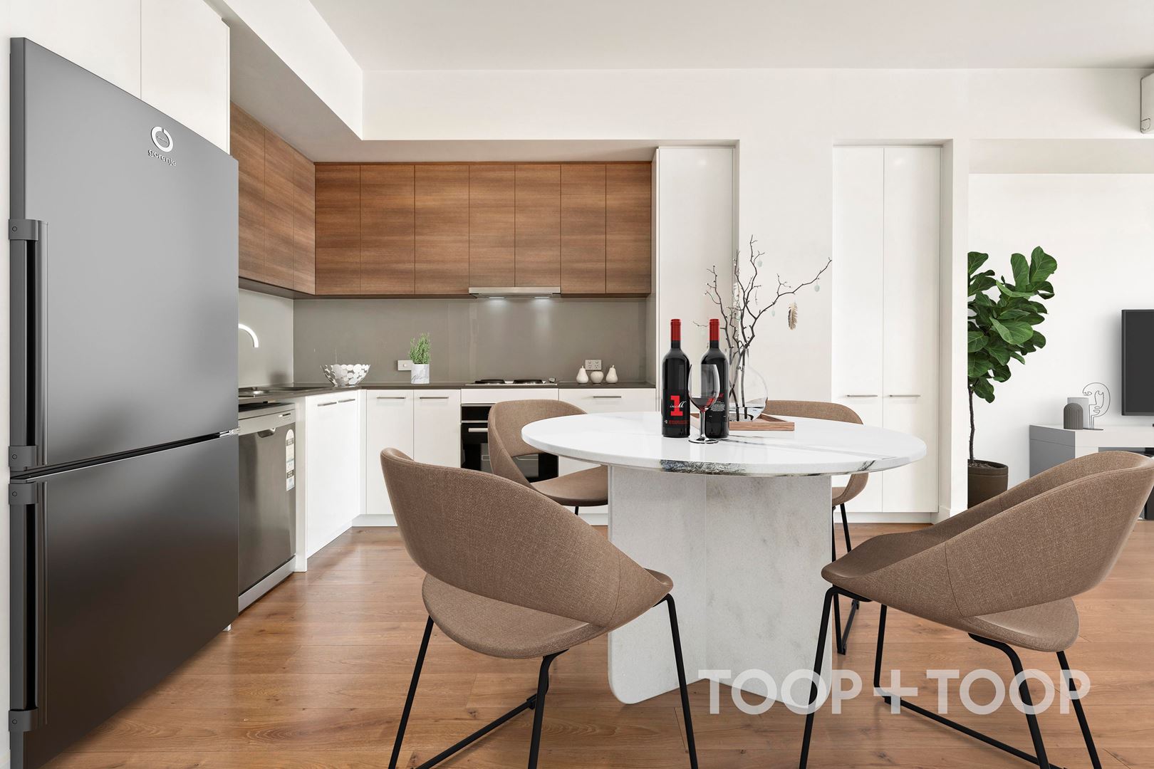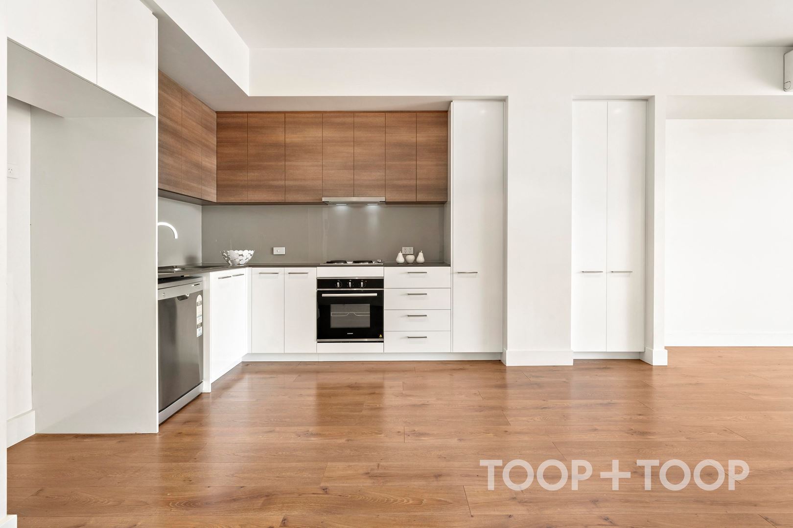 Adjacent is the kitchen which is stylish with the lower white cabinetry and contrasting light grain upper cabinetry . Sleek with modern design, it features stone benchtops, electric appliances, dishwasher and added storage with a single pantry plus double door cupboard.