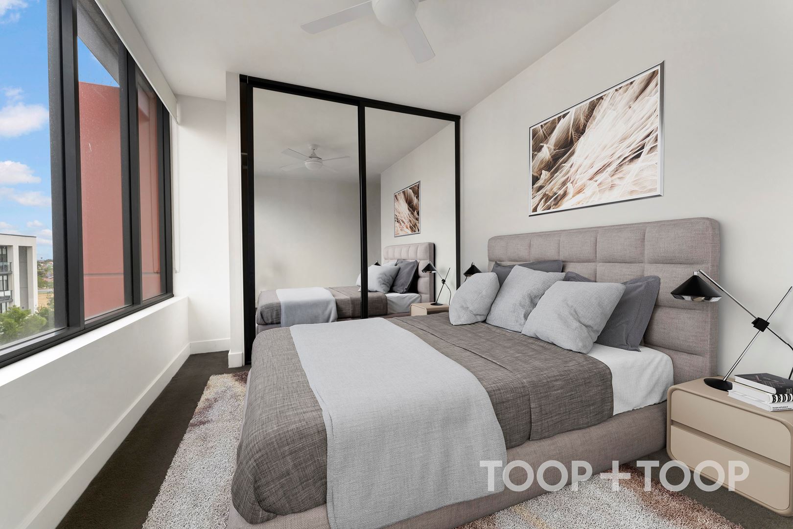 A stylish apartment offering a perfect minimal lifestyle. There are 2 large bedrooms both with mirrored built-in robes and 2 modern sleek bathrooms which have shower cubicles, floating basins and mirrored cabinets plus there are 2 w.c.’s.