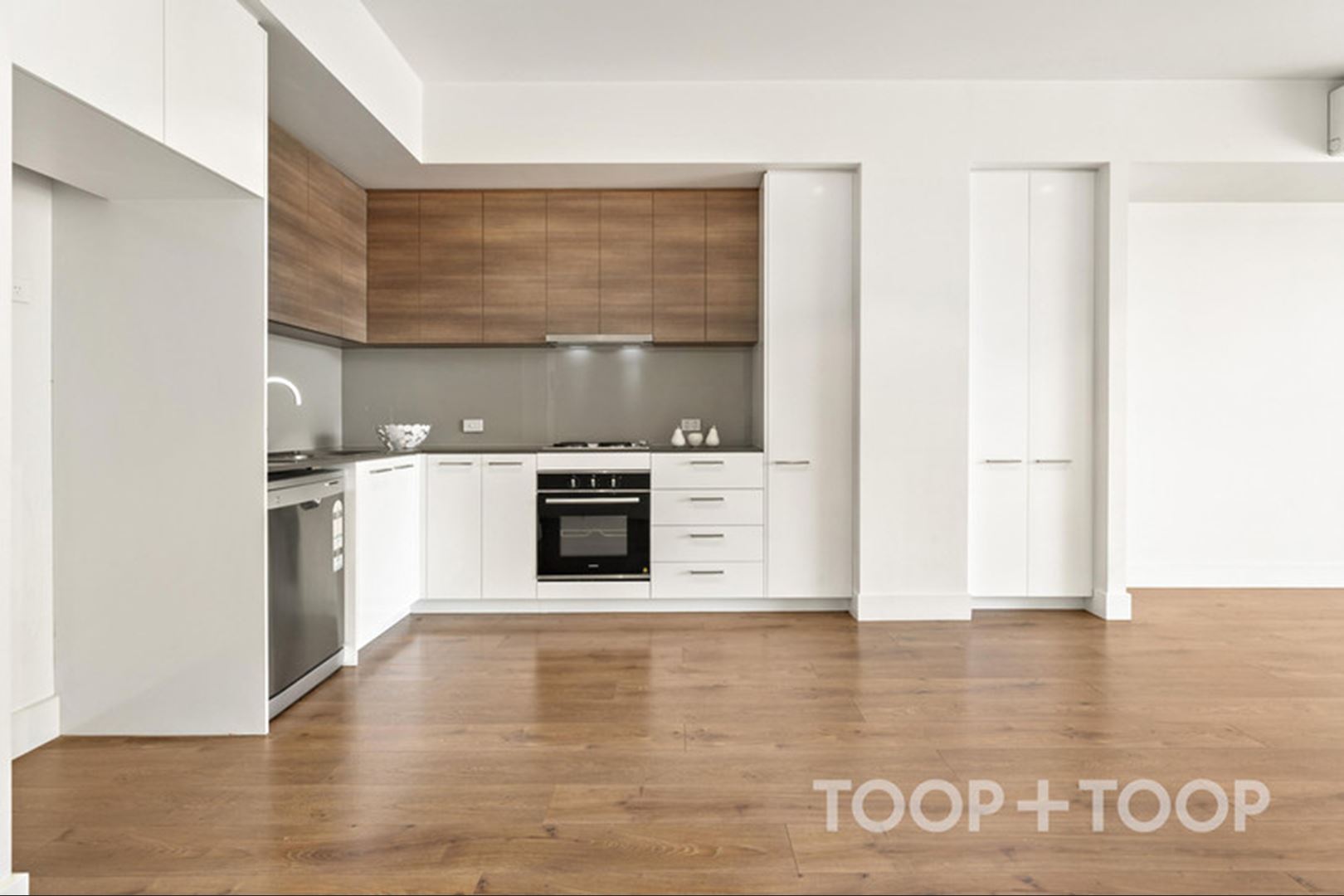 Adjacent is the kitchen which is stylish with the lower white cabinetry and contrasting light grain upper cabinetry. Sleek with modern design, it features stone benchtops, electric appliances, dishwasher and added storage with a single pantry plus double door cupboard.