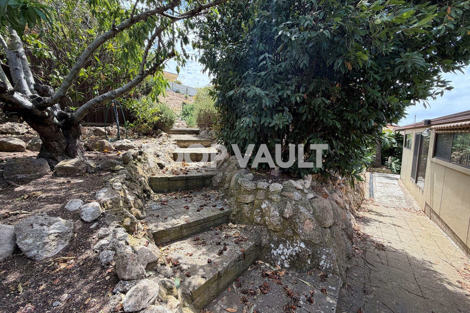Green Sanctuary: A sprawling backyard features established fruit trees, raked limestone paths, and a viewing point at the top of the block to watch the sunrise.