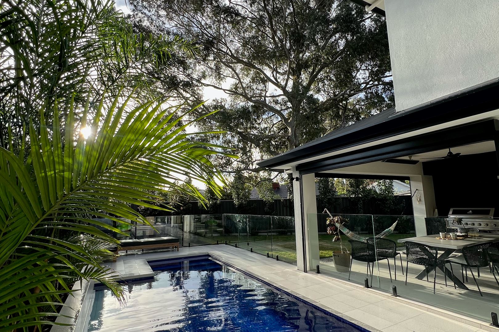 Entertain guest in the tranquil backyard oasis, featuring a swimming pool, and outdoor kitchen.