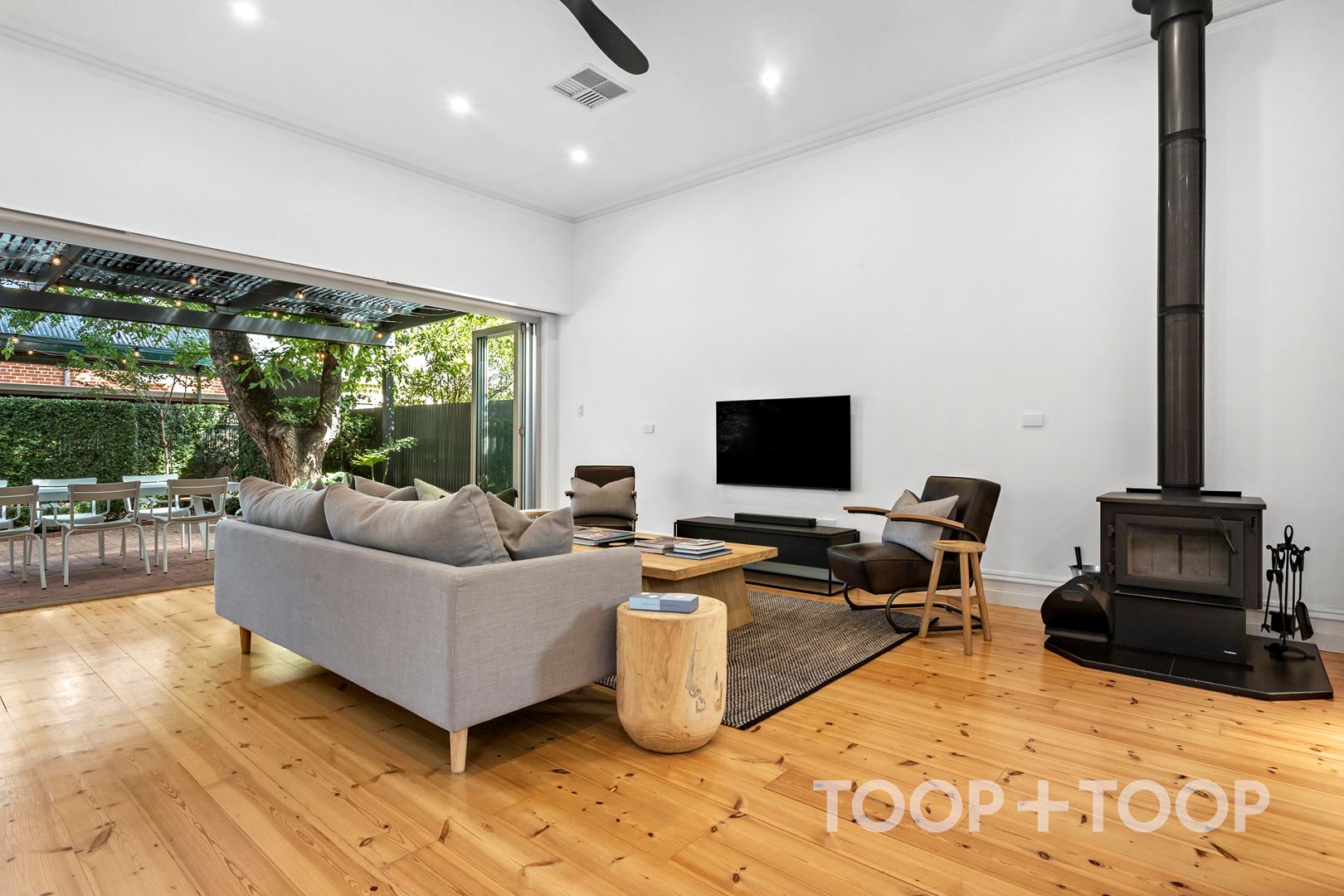 Wide stackable glass doors dissolve the boundary between indoors and out, opening to a paved alfresco entertaining area and pavilion, surrounded by beautifully landscaped rear gardens — an idyllic setting for long lunches, evening gatherings, and effortless year-round entertaining.