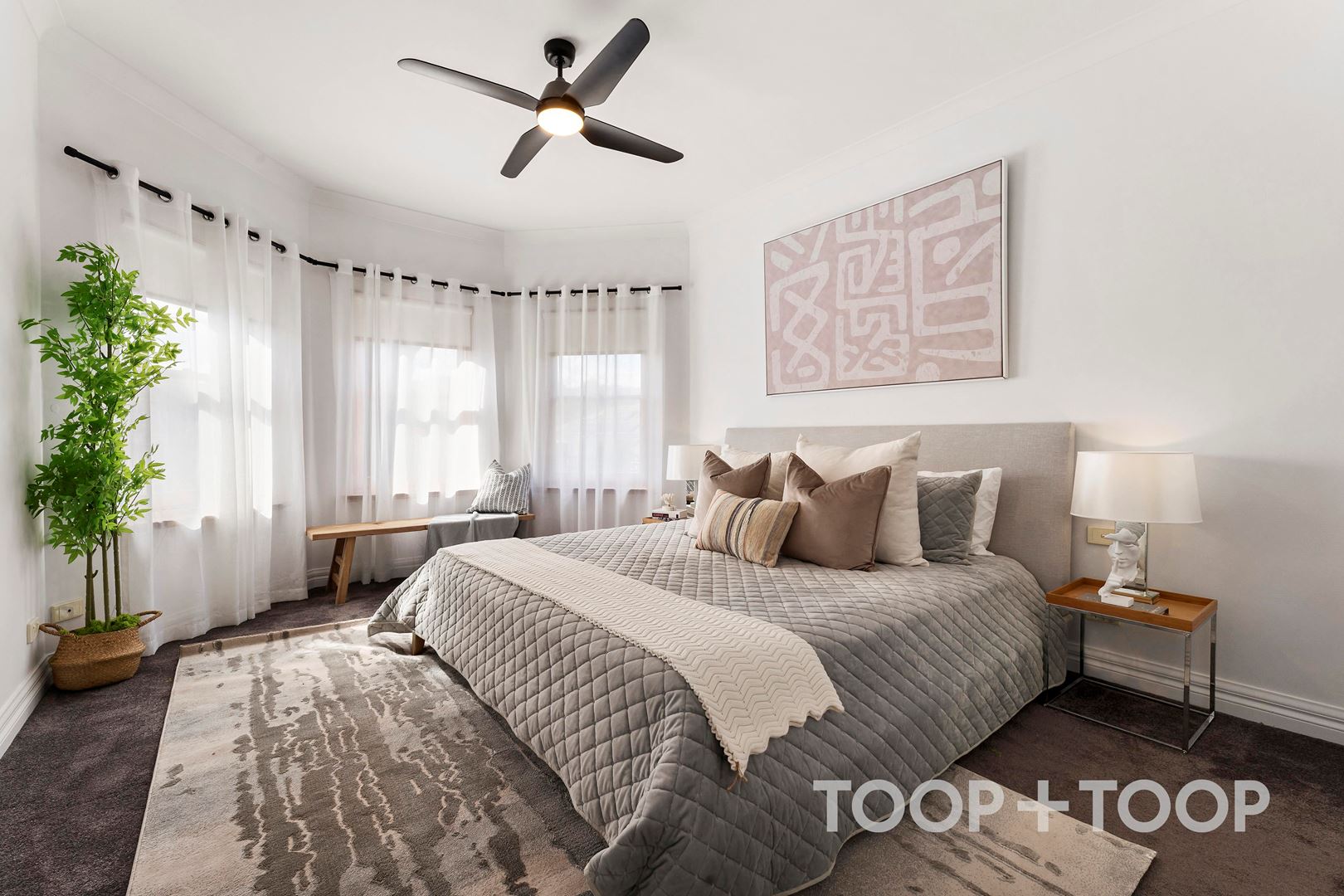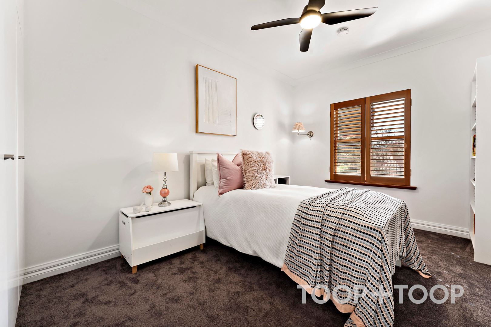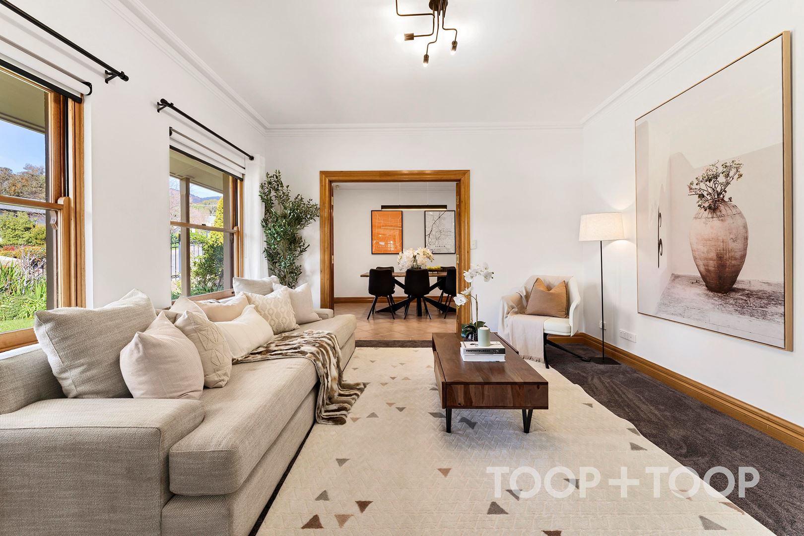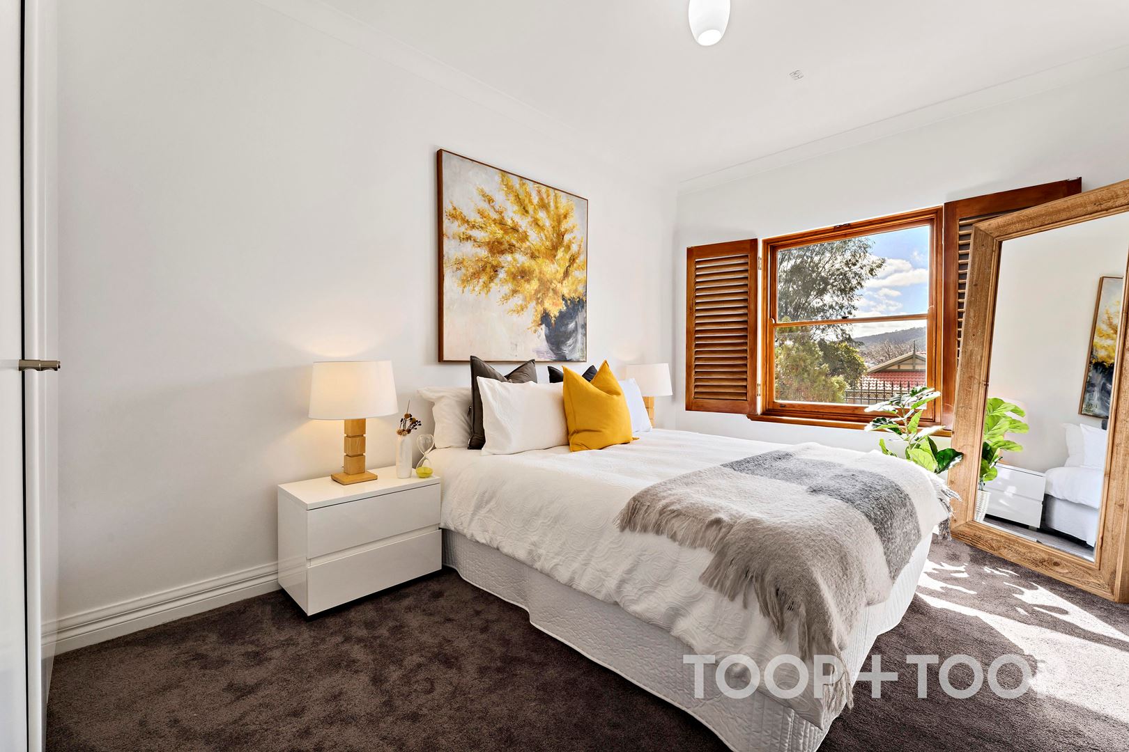 The generous layout accommodates three separate living areas, offering privacy and versatility ideal for family gatherings or quiet evenings. Light cascades through expansive windows, enhancing the serene ambience, with plantation shutters that add a layer of elegance and control. Recent updates of plush new carpeting and fresh paint elevate its contemporary aesthetic, ensuring a warm welcome for its new home owners.