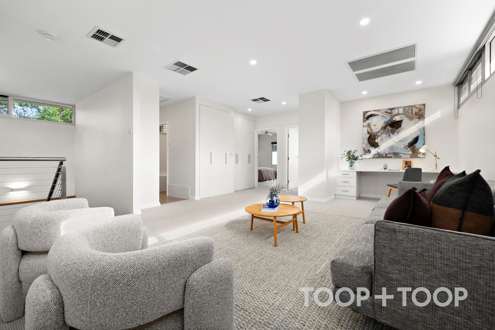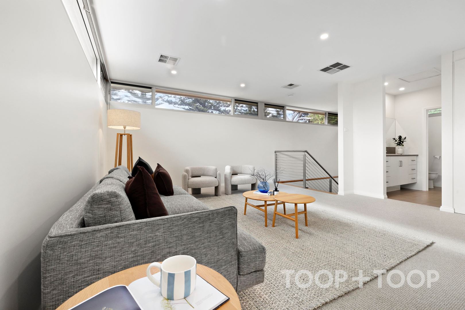 Upstairs, a large living area offers a second zone for relaxation, with discreet kitchen facilities that make it ideal for shared living arrangements or guests. Two generous bedrooms with built-in robes are supported by a bathroom and an additional powder room, reinforcing the home’s practical planning.