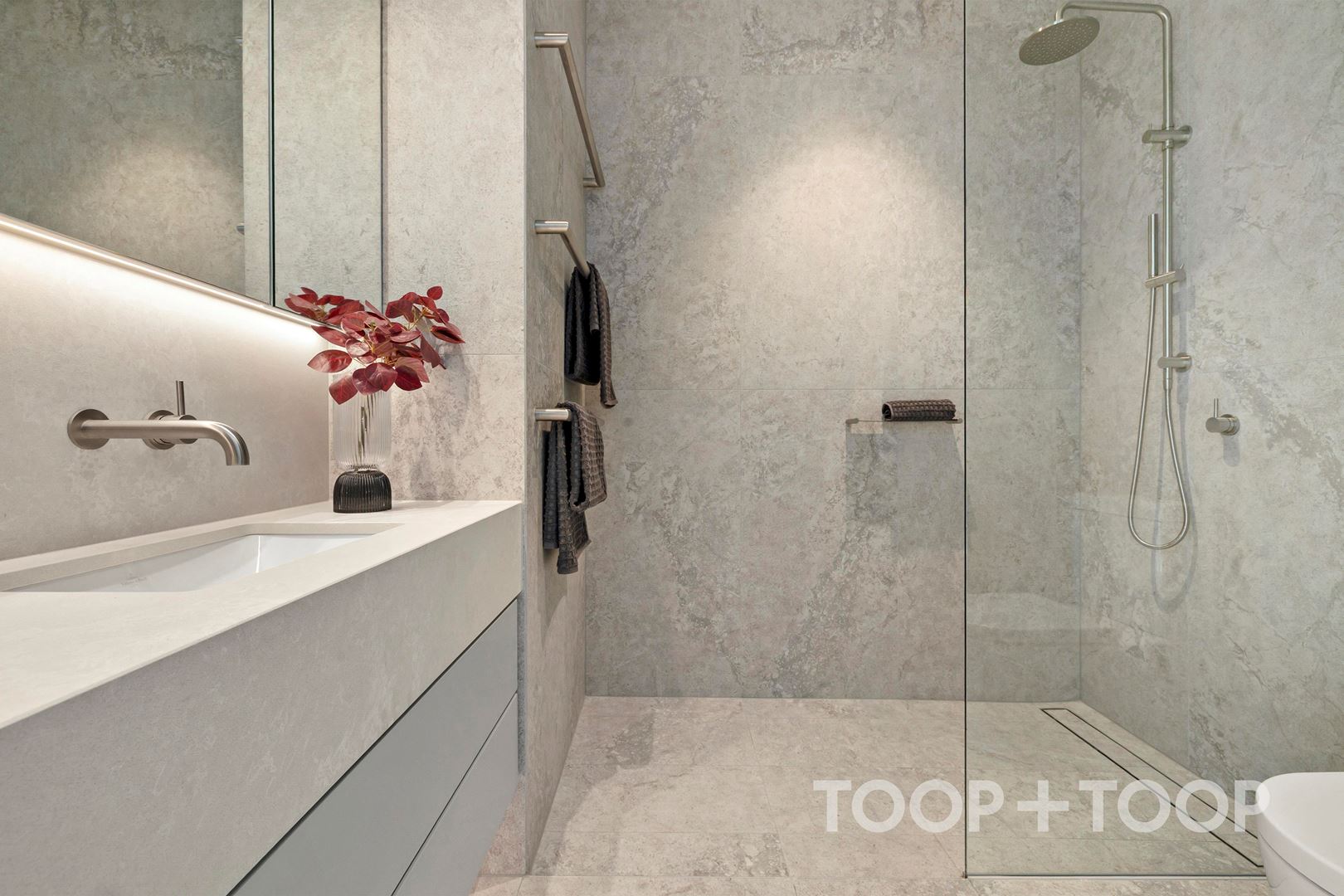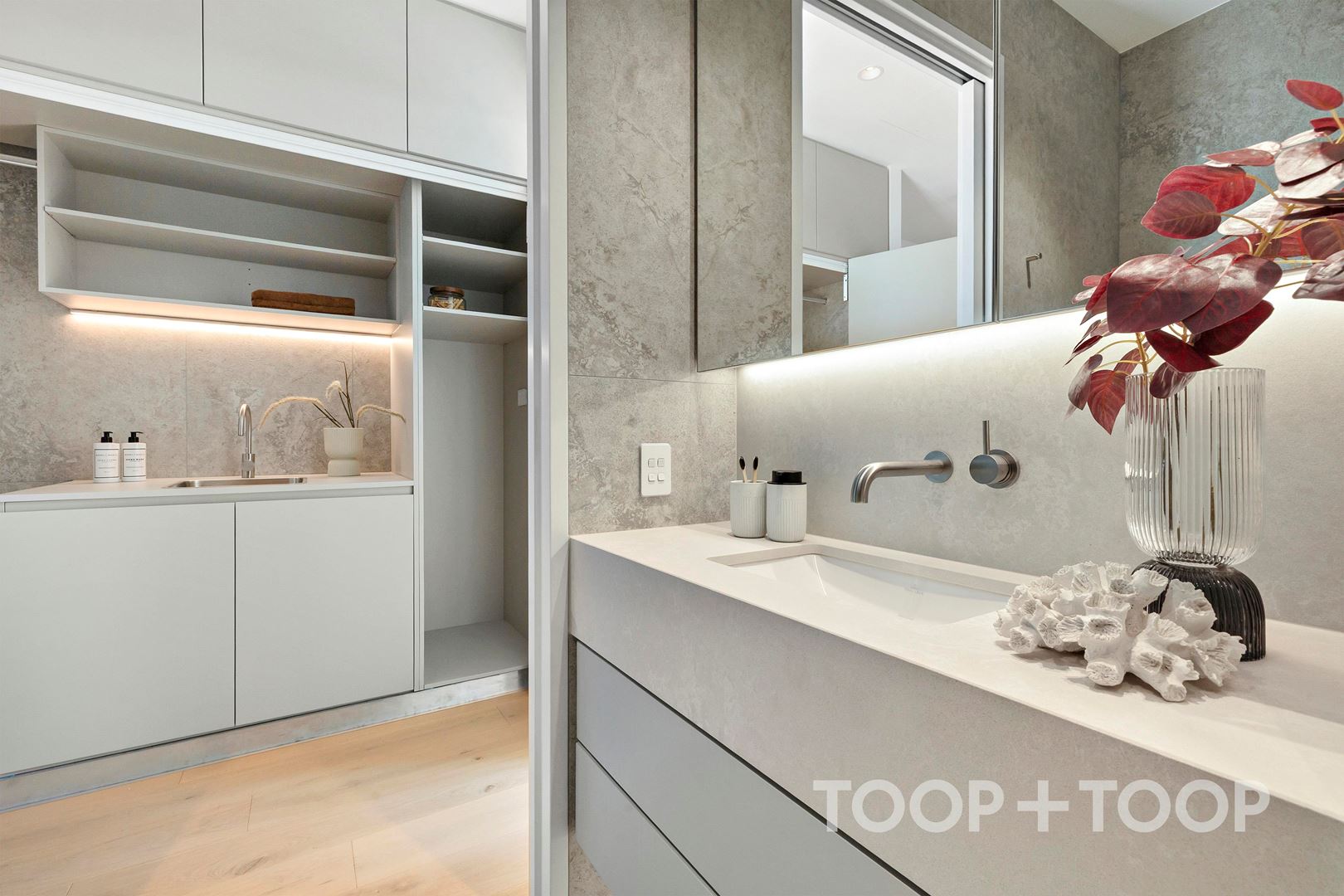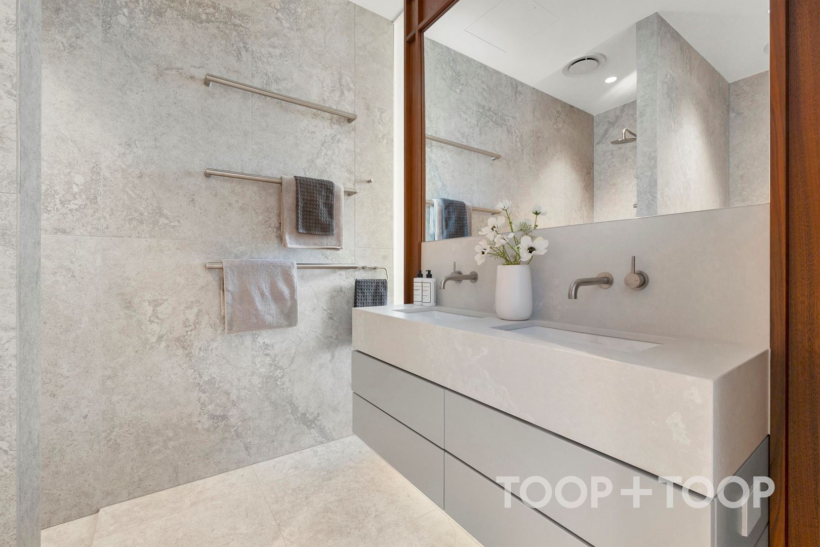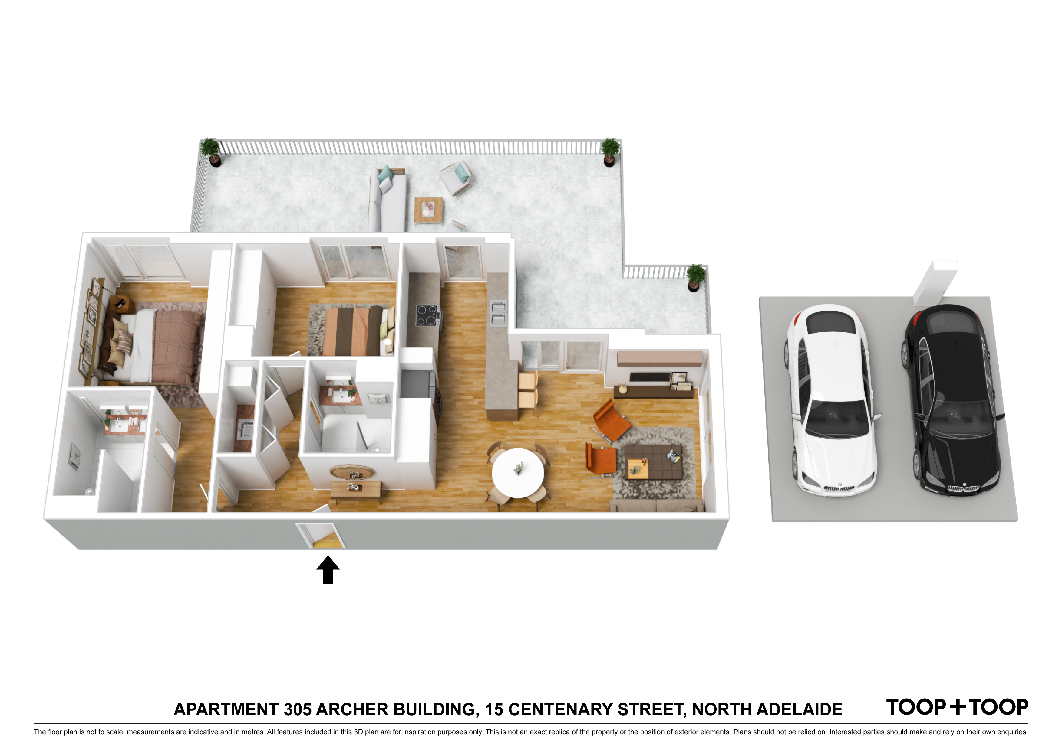 FEATURES + Single storey + Step free entry + Wide doorways + Roll in shower + Accessible parking: 2 side-by-side carparks + Main bedroom with enclosed ensuite + Heated towel rails + Built in robes + Ducted heating and cooling + Double glazed windows + Bespoke walnut joinery + Timber floors throughout + Stone bench tops + Miele appliances + Servery window + Extra large rooftop terrace + Secure building + Video intercom + Dual lifts + Mail room with parcel storage + Building Caretaker + Waste, organic and recycling chutes + Pet friendly