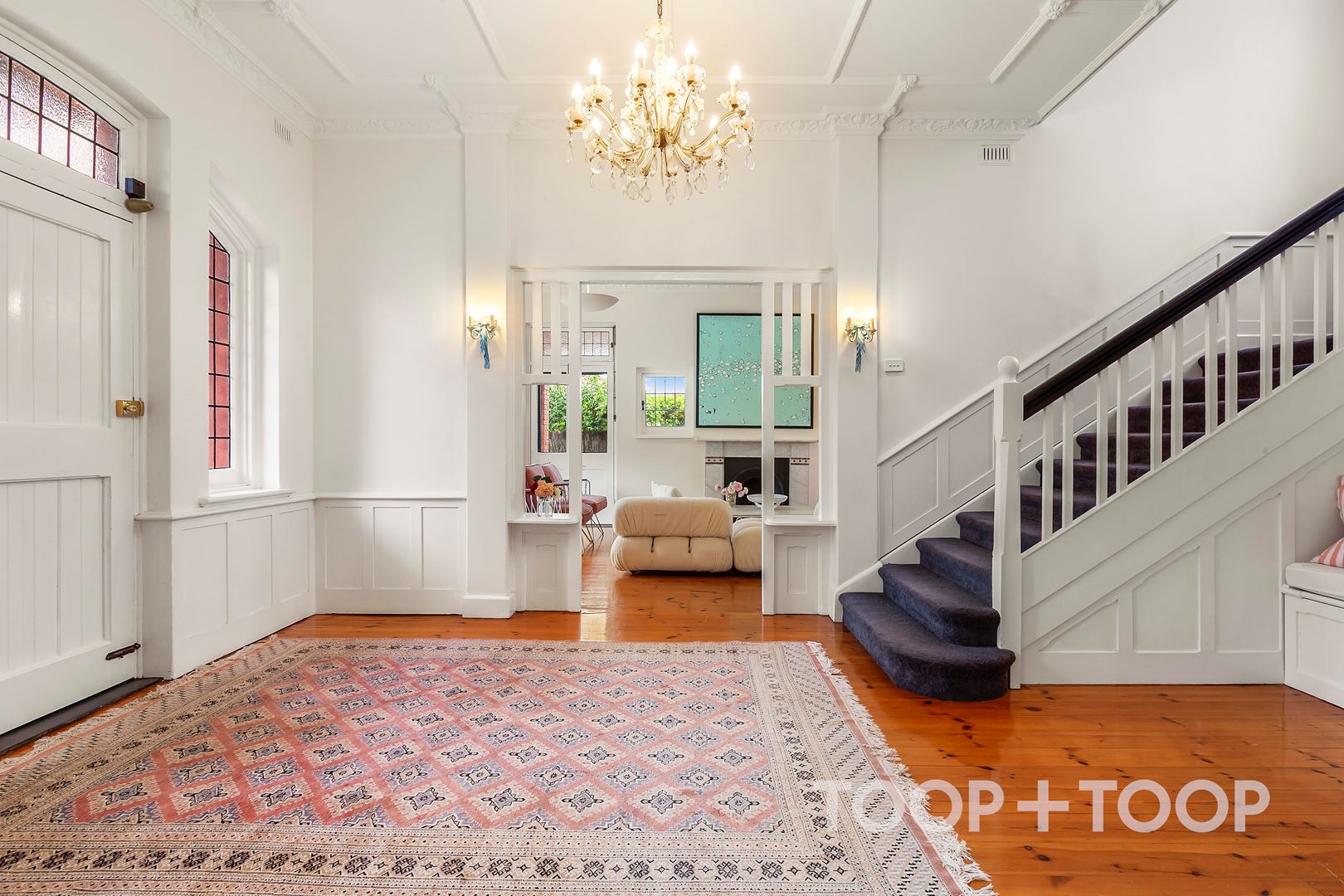 Flanked by two elegant reception rooms, the gracious entrance hall features a glorious chandelier and a sweeping staircase with handcrafted timber balusters that ascend past soaring leadlight windows to the upper floor.