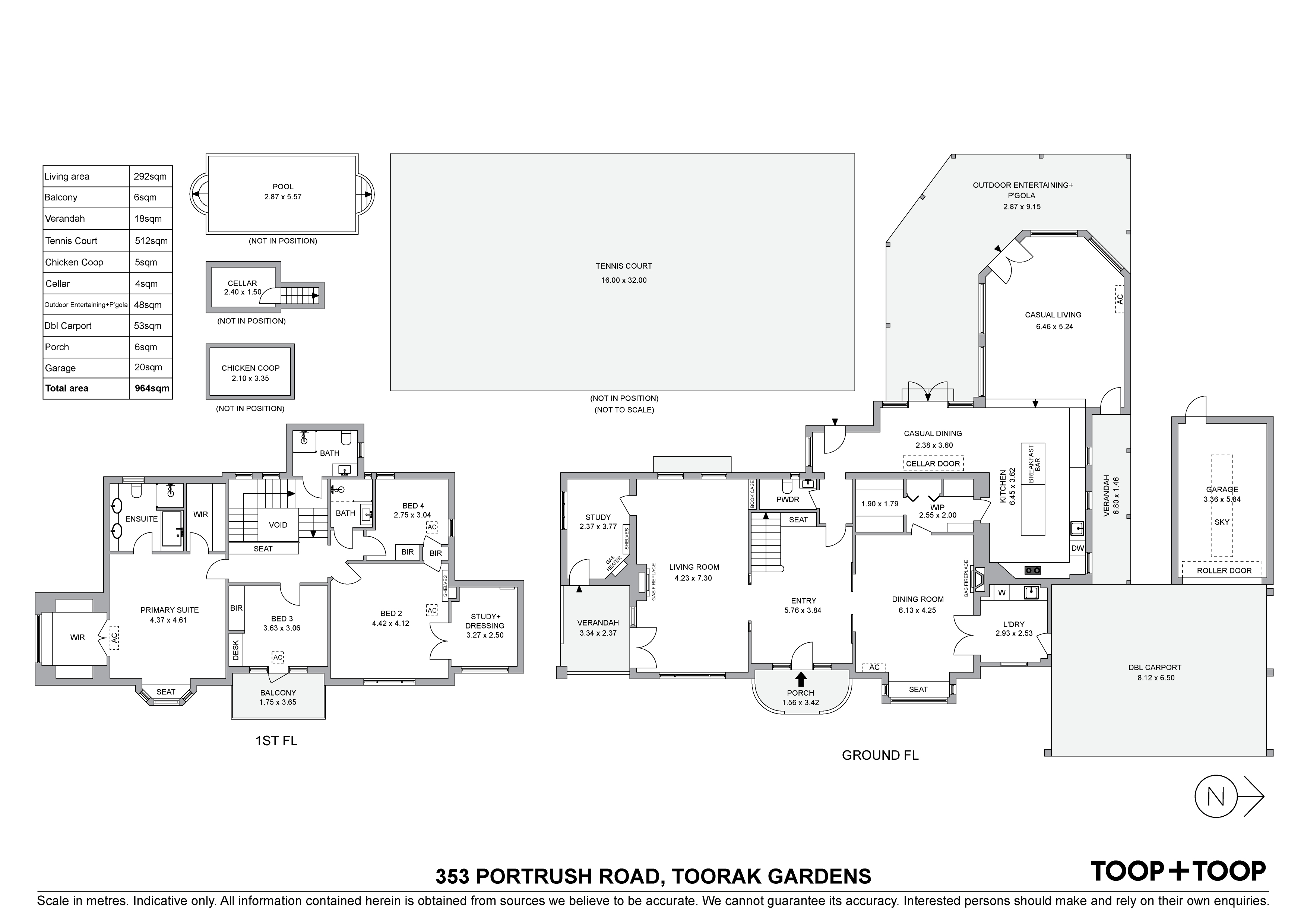 From a wisteria clad pergola, outdoor dining sits beside the fully tiled pool and north/south all weather tennis court, floodlit for night matches.