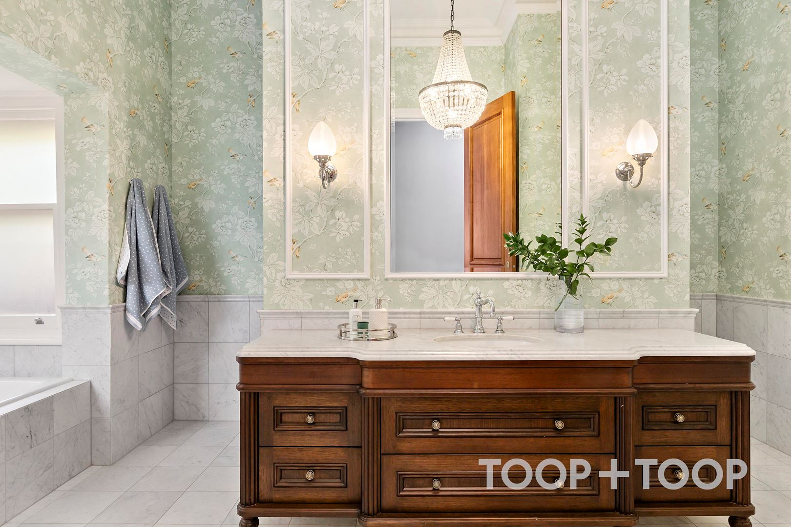 Thoughtfully positioned to create their own sophisticated retreats through Sophie Katina cabinetry, Sanderson wallpaper and Colefax & Fowler fabrics, the home office, main bathroom and laundry/mud room respectively deliver chic individuality - spaces that feel curated, not merely functional.