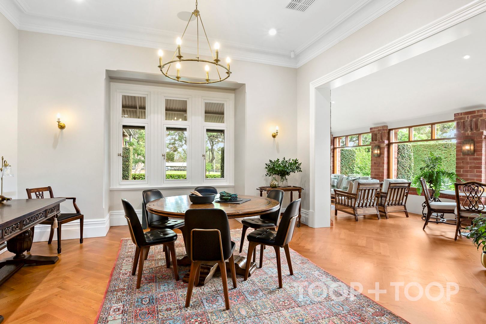 Interconnecting living zones unfurl with grace, balancing formal and relaxed spaces in equal measure. A formal dining room inspired by Ralph Lauren sets the scene for epic dinner parties, while nearby, a divine light-filled sunroom takes great pleasure in the slower moments: afternoons spent reading by the fire or watching children bound across the reserve beyond.