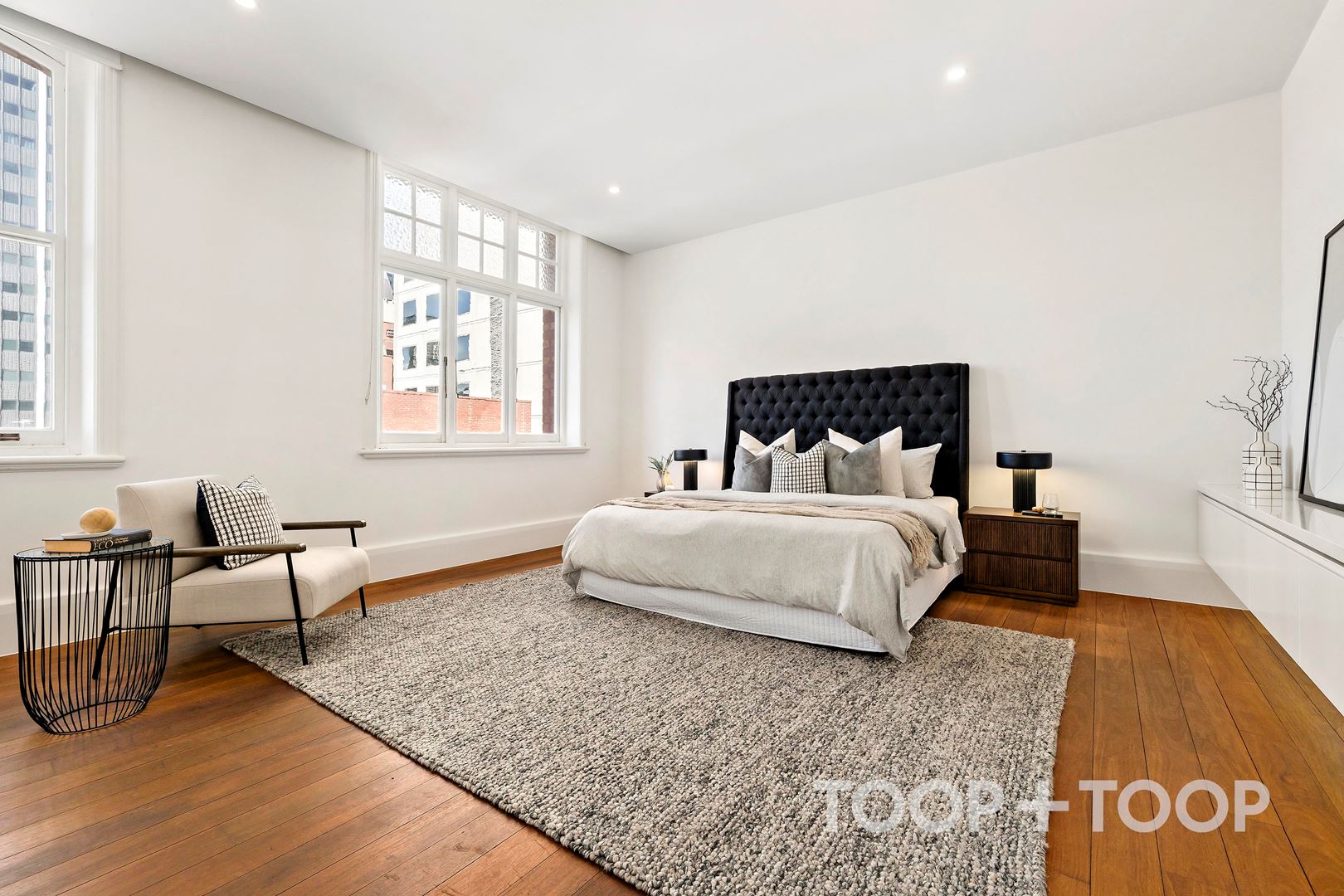 Inside, soaring ceilings, vast open spaces and abundant natural light create a true blank canvas. A fully equipped kitchen delivers premium functionality, with integrated NEFF induction cooktop, oven and microwave, a SMEG dishwasher, stainless steel splashback, Siema sink and a fully integrated Liebherr fridge/freezer. A concealed bathroom with shower and European laundry sits discreetly behind the kitchen, while block-out blinds, sheer curtains and quality finishes throughout enhance everyday comfort.