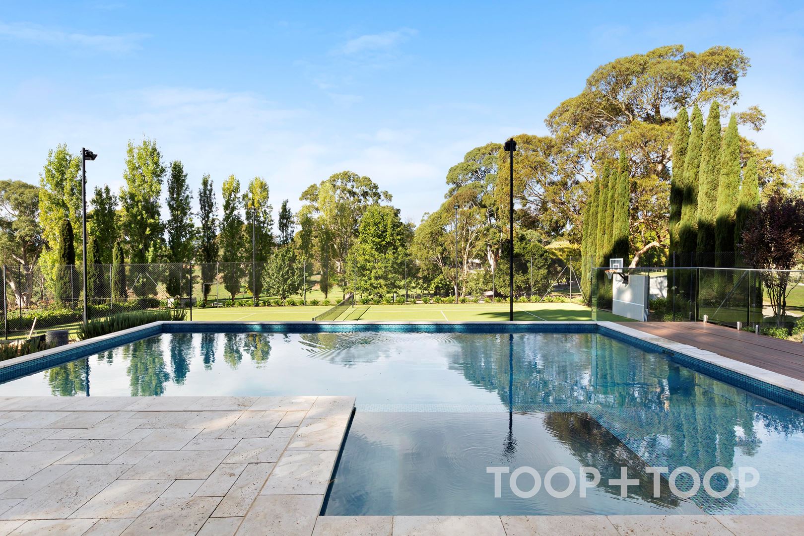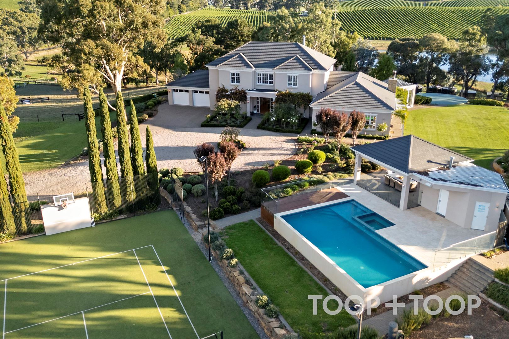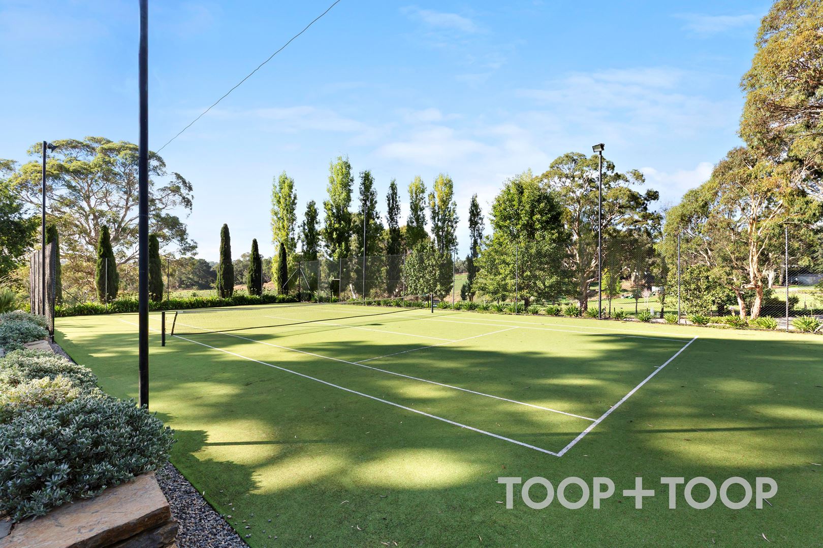 A full-size tennis court framed by Kanmantoo Bluestone walls and including lights and a basketball ring, adds another layer to the lifestyle offering, allowing for year-round outdoor entertainment and activities.