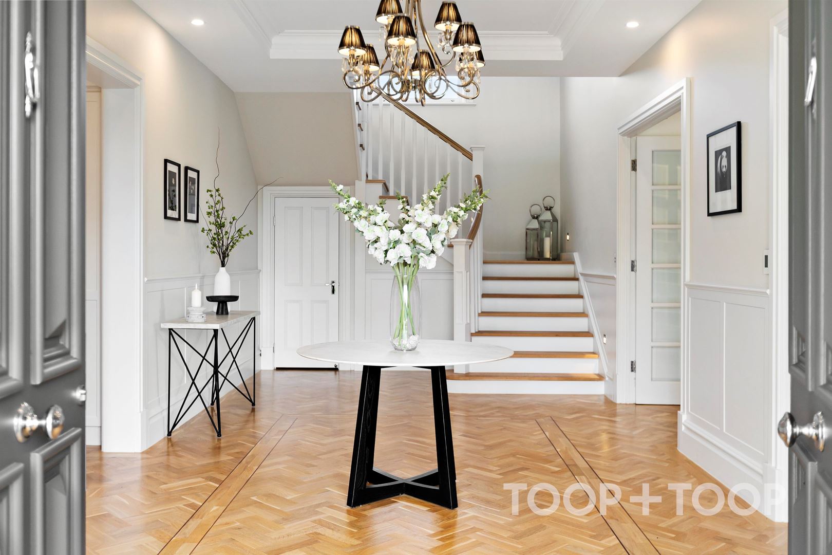 Inside the stately front doors of the home, European oak herringbone floors run with precision underfoot. Cabinetry by Walls Brothers is featured throughout, its quality evident in both form and finish.