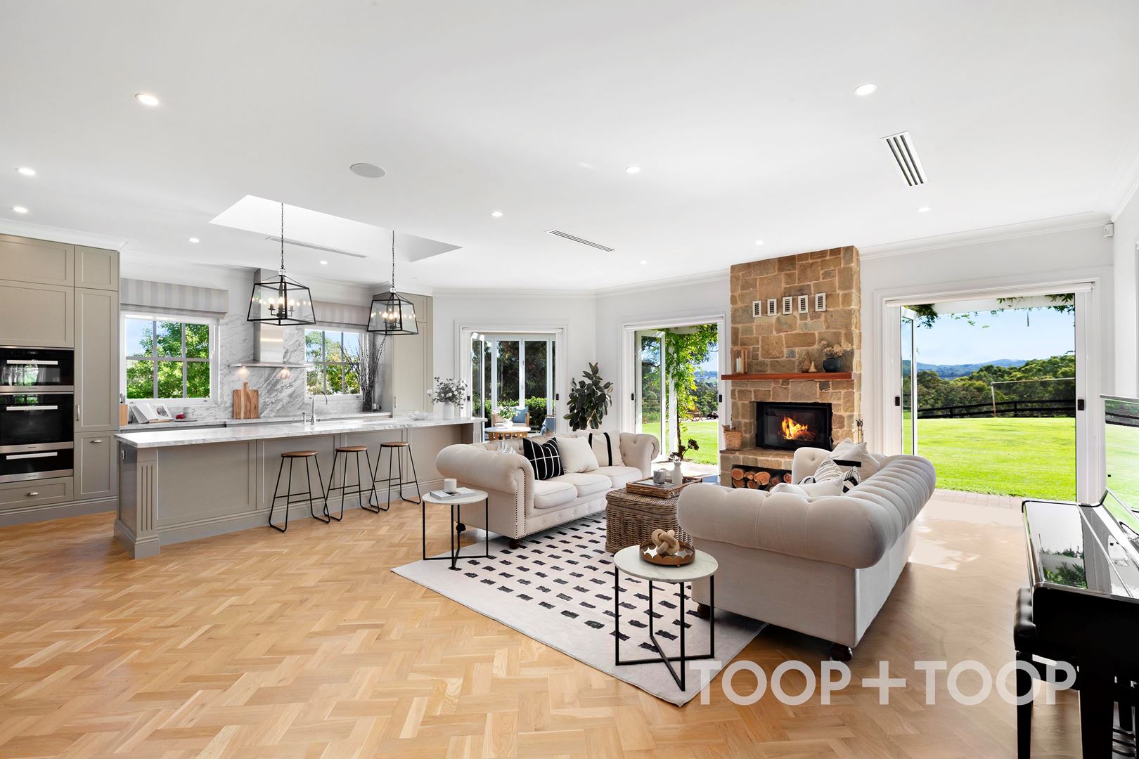 The main living domain is generous without excess. A Chiminees Philippe fireplace anchors the room, offering both warmth and a natural place to gather as the seasons shift. Expansive and beautifully proportioned glass doors invite natural light deep into the home and open up to the enchanting sunsets, scents and bird sounds of the Adelaide hills.