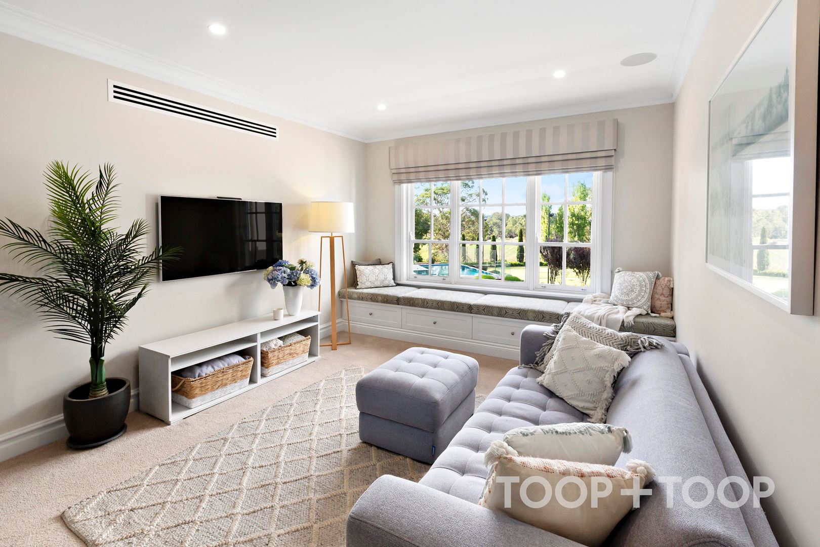 A central living space offers a place for quiet connection, anchored by a large window nook that invites you to sit, read or simply take in the view of the nearby swimming pool and tennis court.