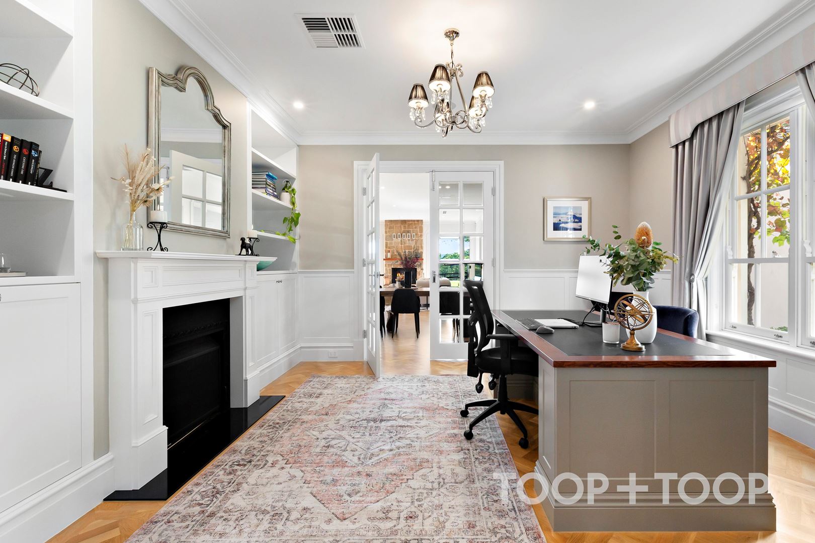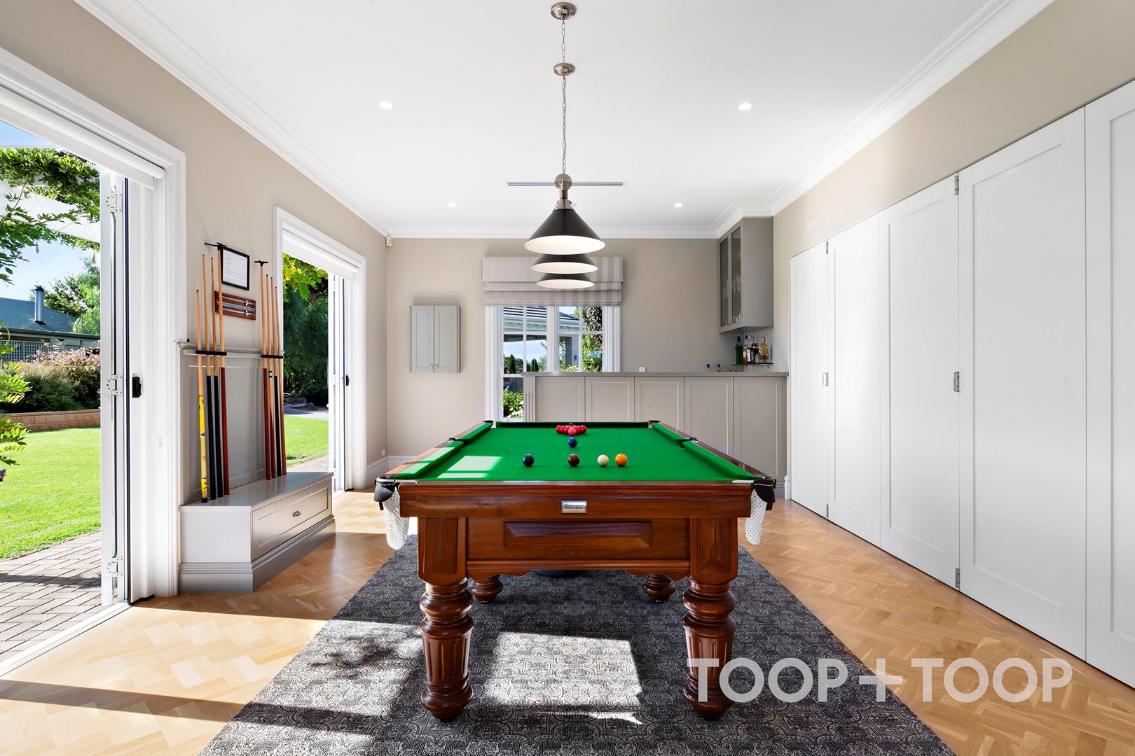 The formal sitting room is a picture-perfect space for calm relaxation. Bathed in natural light through elegant, symmetrical windows, it offers a more intimate retreat within the home. Bifold doors open through to the billiards room, allowing the spaces to work in tandem when entertaining, or remain separate for quieter moments.