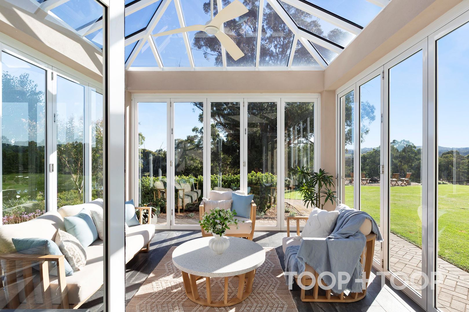 Completing the spectacular ground floor is a stunning glass observatory. An elevated and singular space that feels entirely at home within the broader design. By day, it captures light and landscape. By night, it offers a quiet place to pause beneath the stars and sky, adding a rare and considered lifestyle experience to the home.
