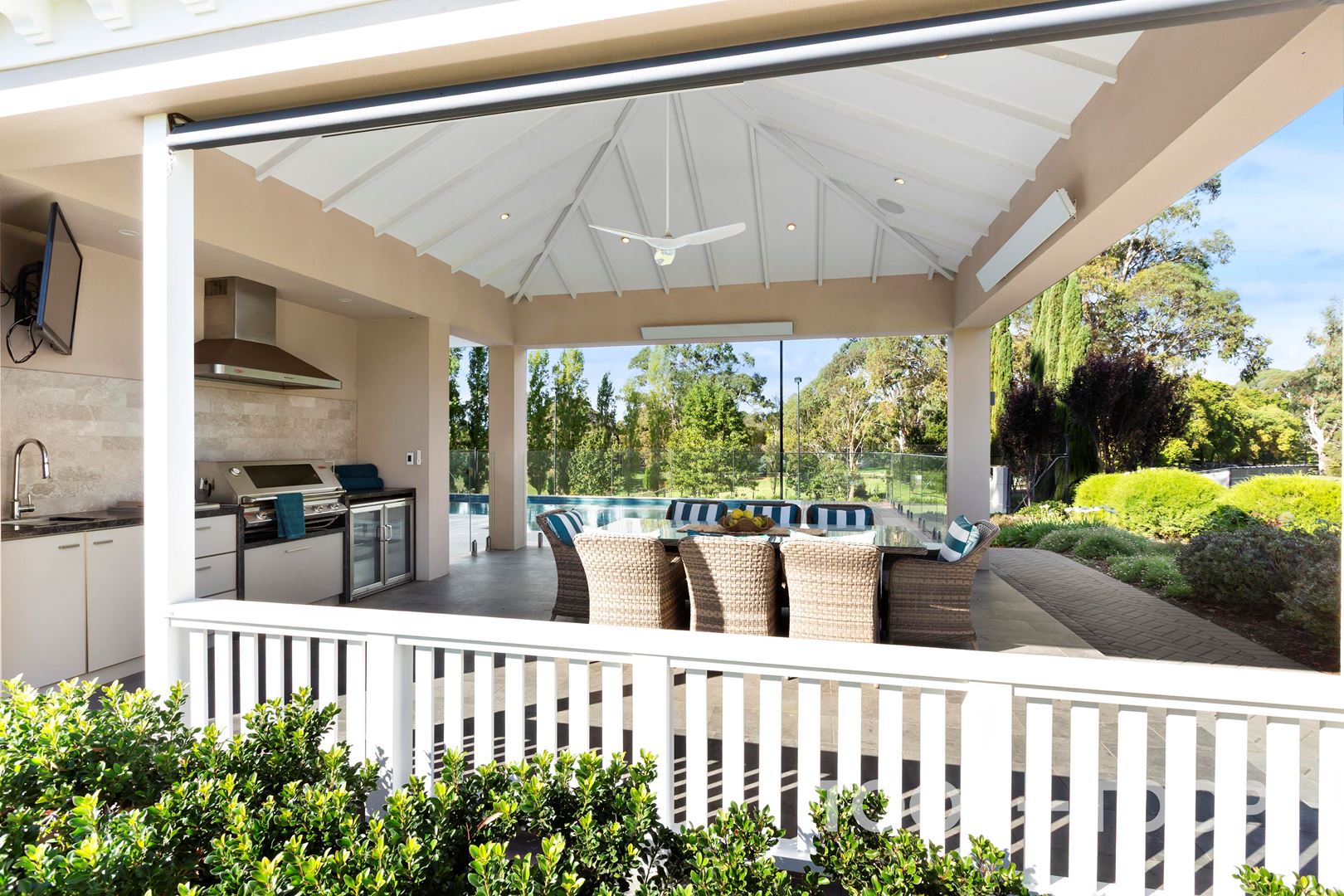 An outdoor entertaining pavilion extends naturally from the home, creating a setting that accommodates everything from long, relaxed lunches to parties or gatherings of scale. It connects seamlessly to a heated swimming pool with an environmentally friendly (naked) copper filtration system, and adjoining pump room, complete with its own bathroom, ensuring ease of use without interrupting the flow of the main residence.