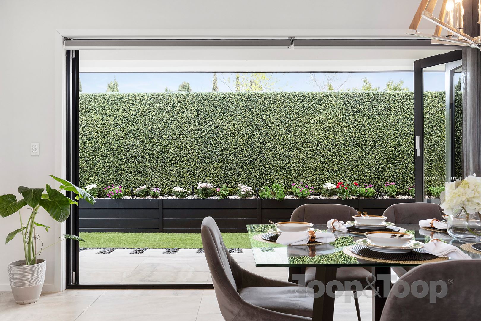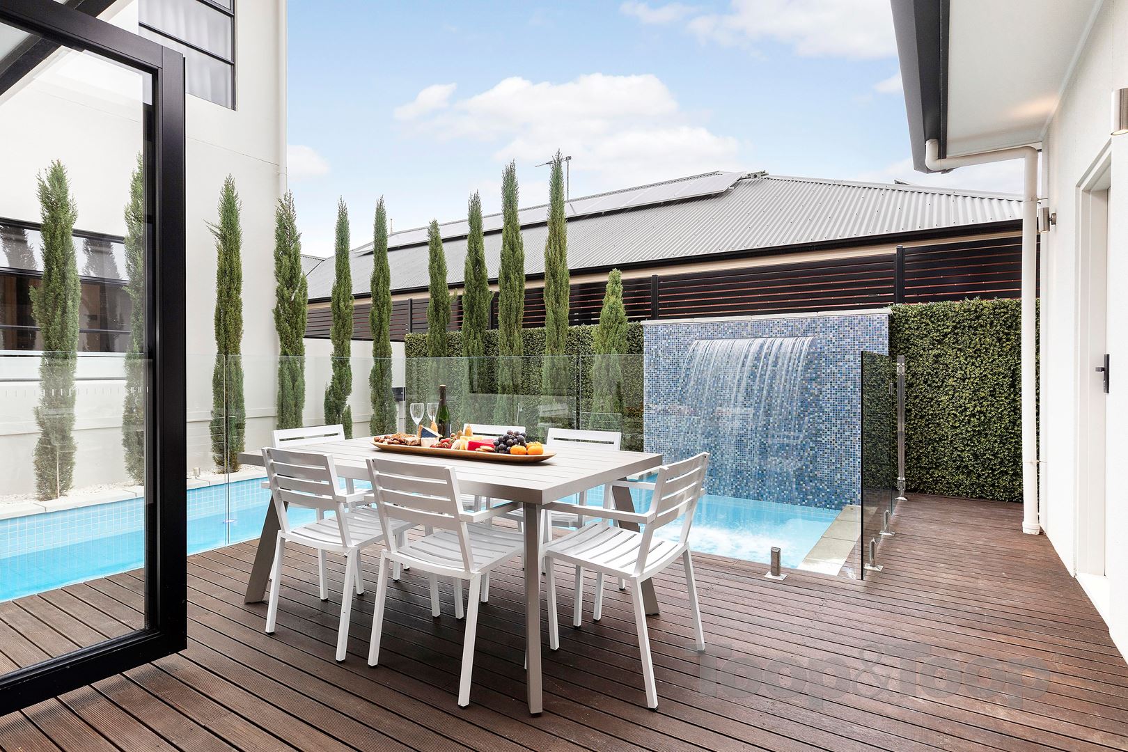 Bi-fold doors open the stylish open plan living and dining area to both poolside dining and water feature to the side, and undercover entertaining and private low maintenance courtyard garden to the rear.