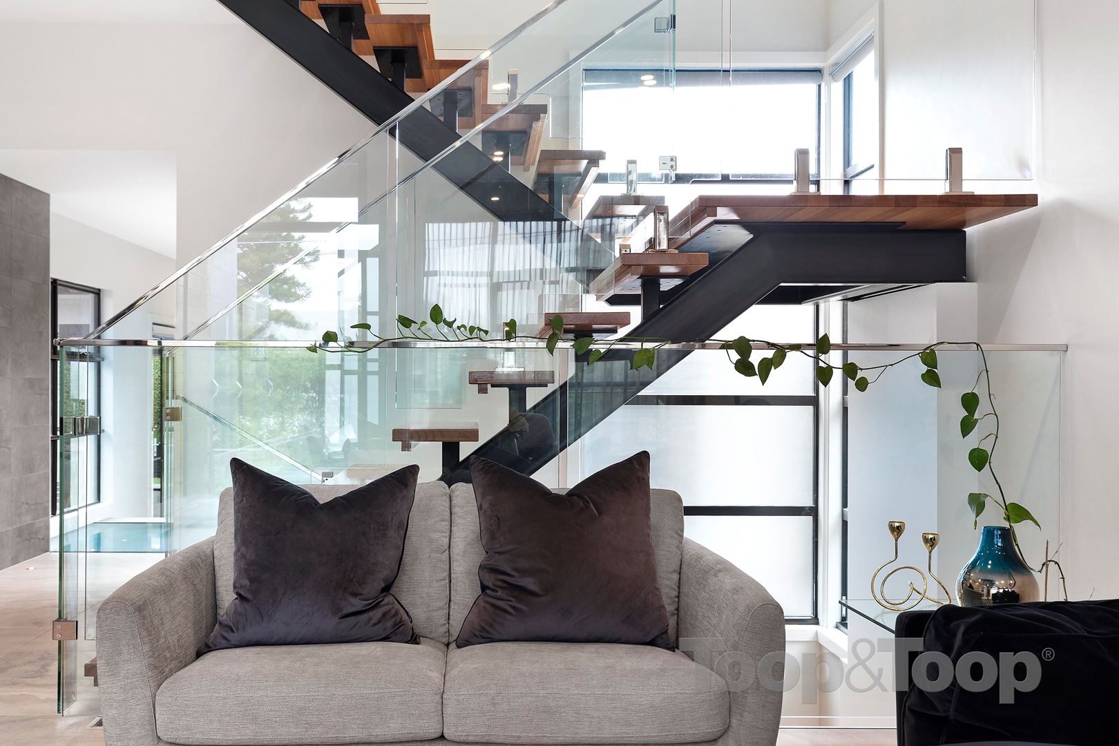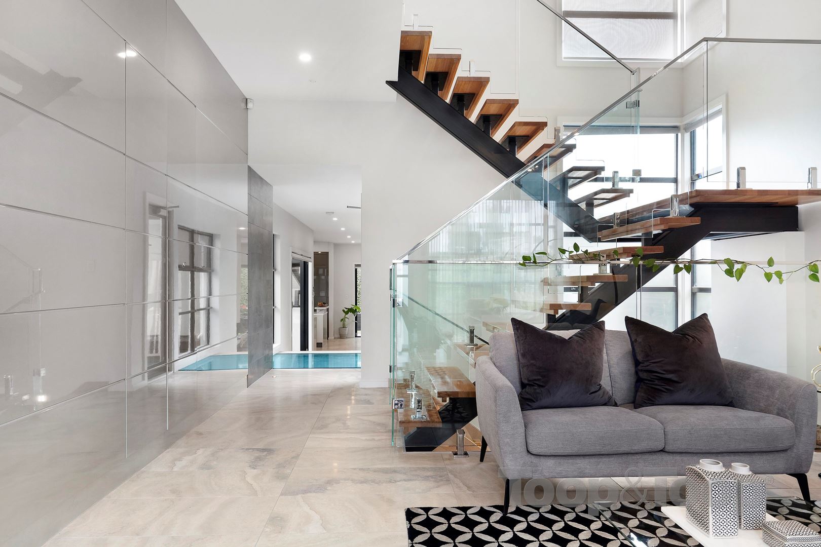 The soaring entrance and sophisticated living area draw the eye to a contemporary light filled north-facing expanse accessed by the wow factor glass bottomed walkway link, traversing the resort style, saltwater lap pool complete with swim jets, lighting and solar heating.