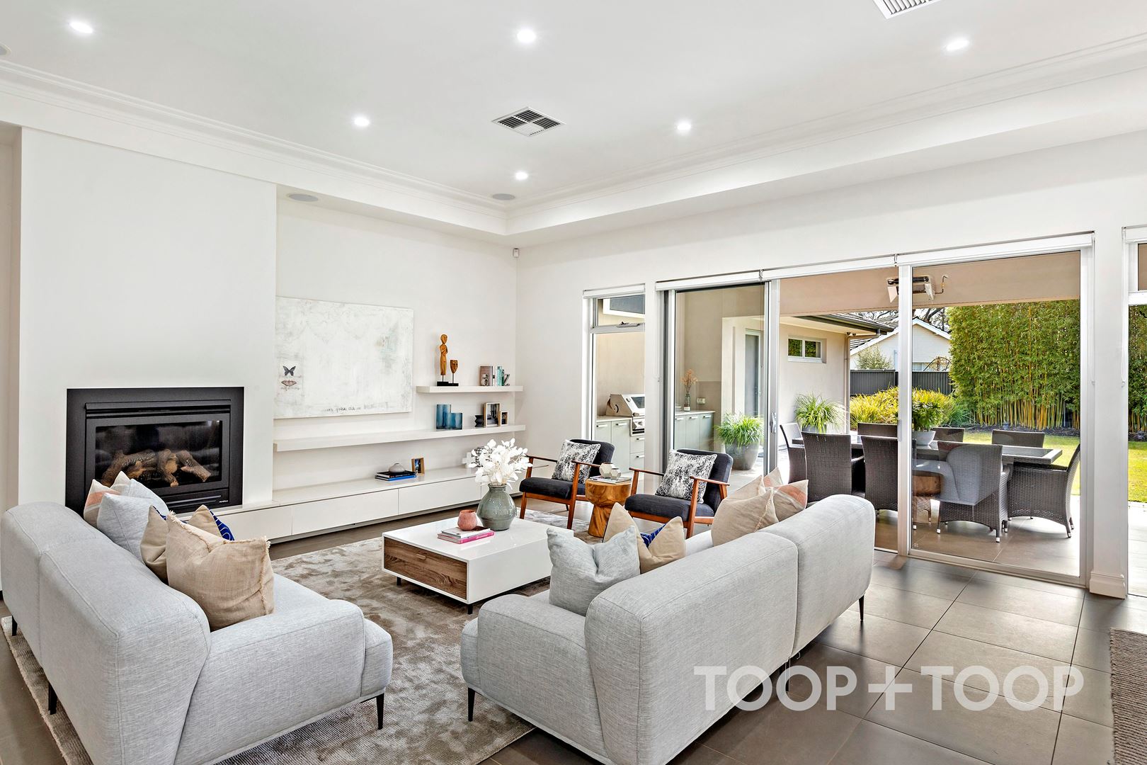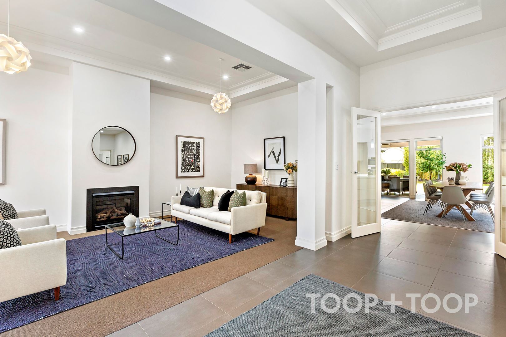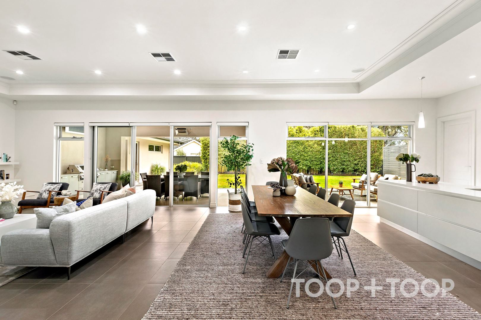 Elevated from the street, this home has gracious presence with wide frontage, generous eaves, and a formal portico. Entering the home there is an immediate sense of refined, comfortable living with impressive high coffered ceilings, quality flooring and large double doors leading to rooms of impressive proportions. The formal living area is a lovely large space with a peaceful outlook to the front garden and with the added cosiness of a feature gas fire in hills winters.