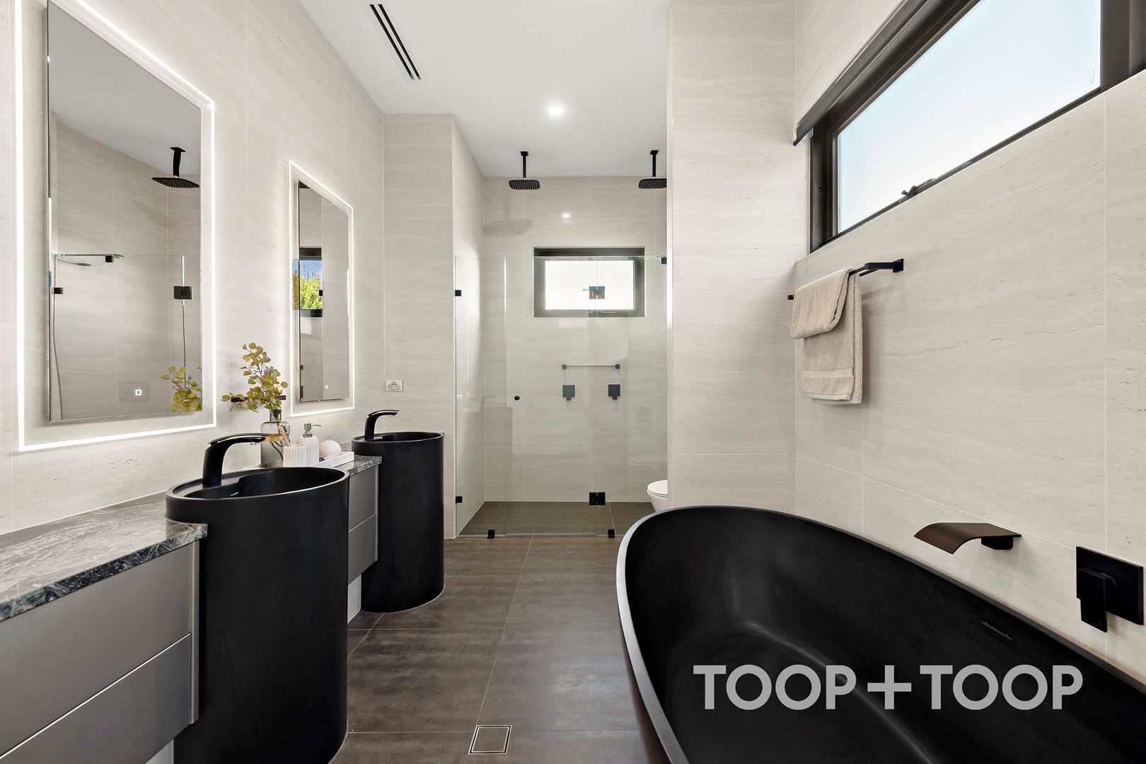 + Second bathroom with frameless shower, stone benches, dual vanity basins, designer freestanding bath and toilet