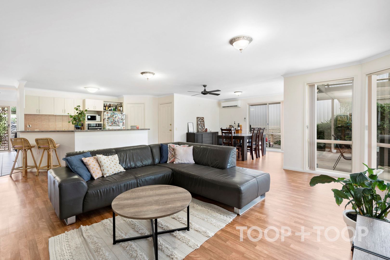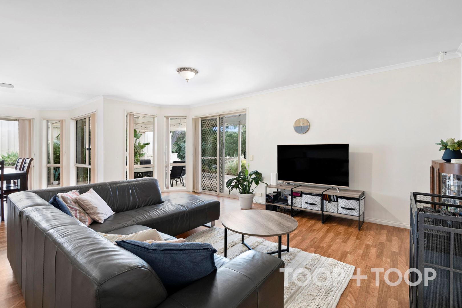 A private lounge room offers privacy and peace away from the open-plan kitchen, living and dining area, ideal for families wanting multiple living spaces. Abundant sunlight streams through the rear windows which open out to a large outdoor entertaining and bbq area, overlooking a leafy green back yard.
