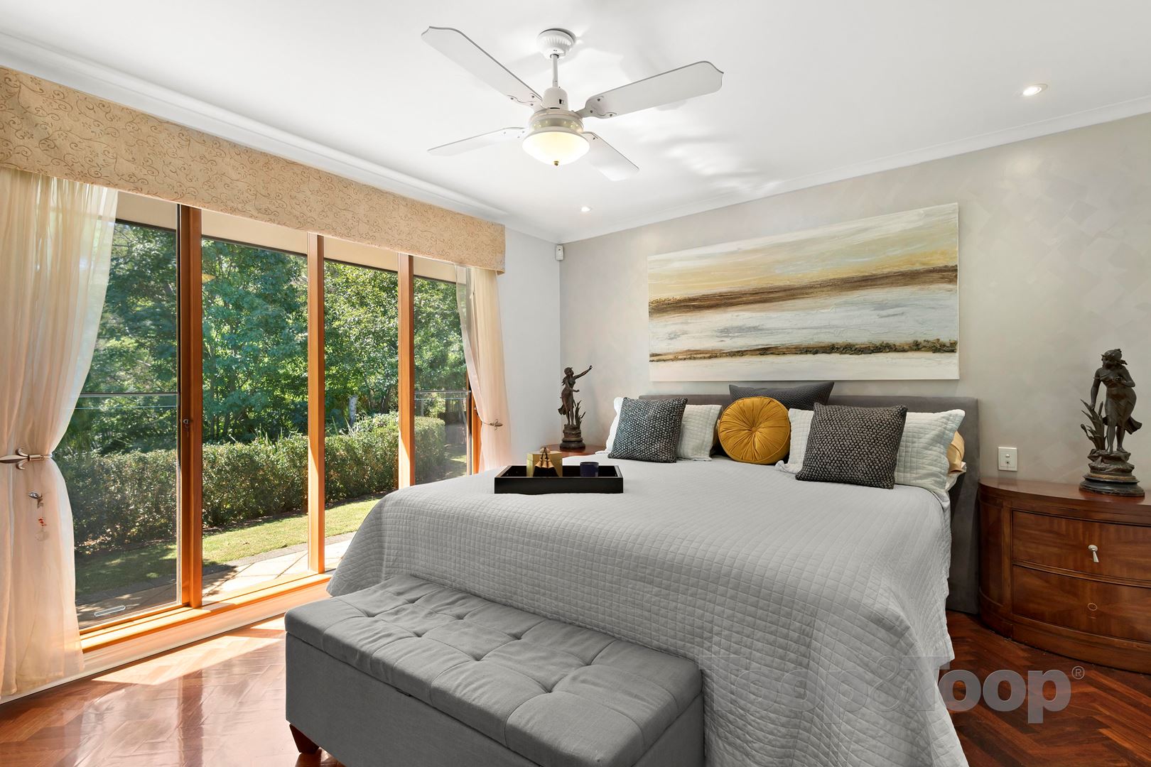 The luxurious master suite with Jarrah parquetry flooring and ceiling fan looks out into the gardens, and includes a walk-in robe and into the palatial en-suite with dual basins, stone top, corner spa bath and shower. 2 of the 3 remaining bedrooms include built-in robes and ceiling fans with the updated main bathroom including a bath and shower. The 4th bedroom is currently utilised as a home office/study but could easily be converted back to a bedroom.