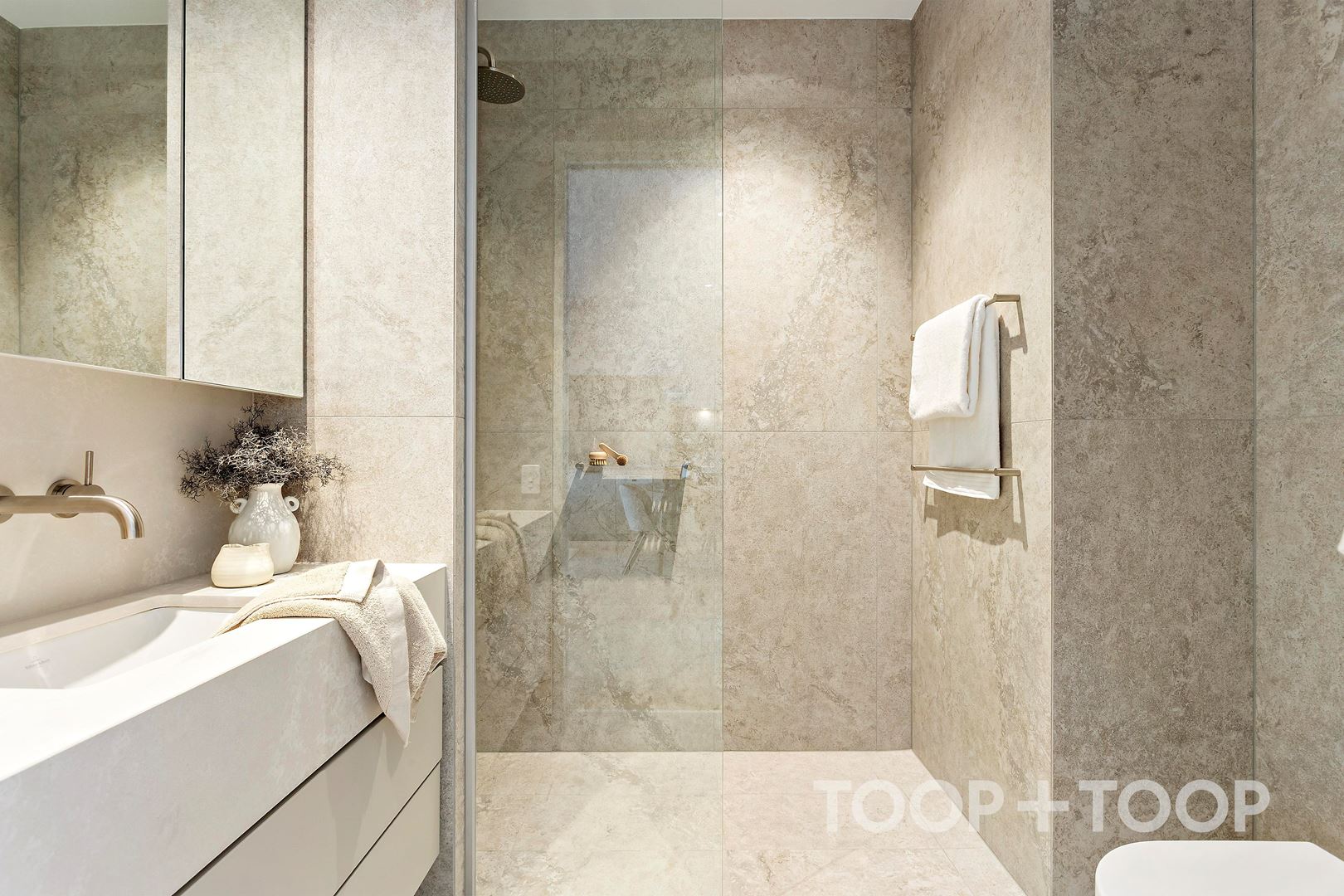The spacious bedroom is complete with built-in robes and a luxury bathroom, tastefully finished with stone vanity and frameless glass shower screen.