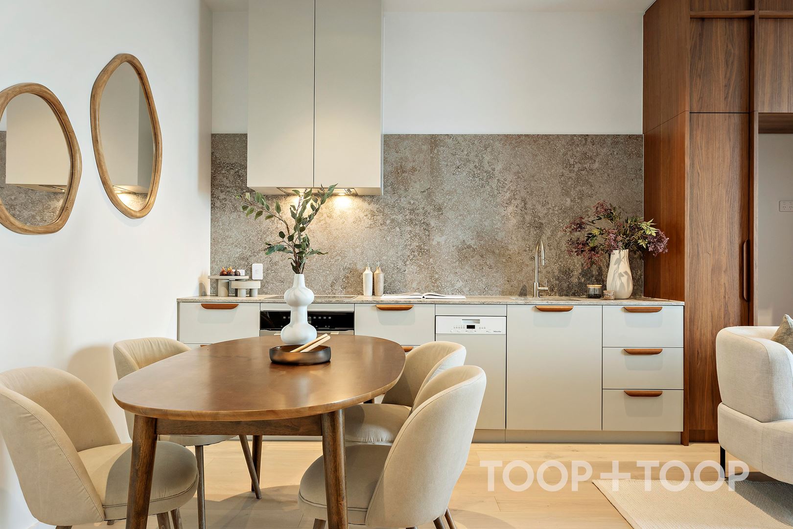 Stylish oak wood flooring flows into a galley-style kitchen with floor-to-ceiling oak cabinetry and stone benchtops, accentuated by premium Miele appliances.